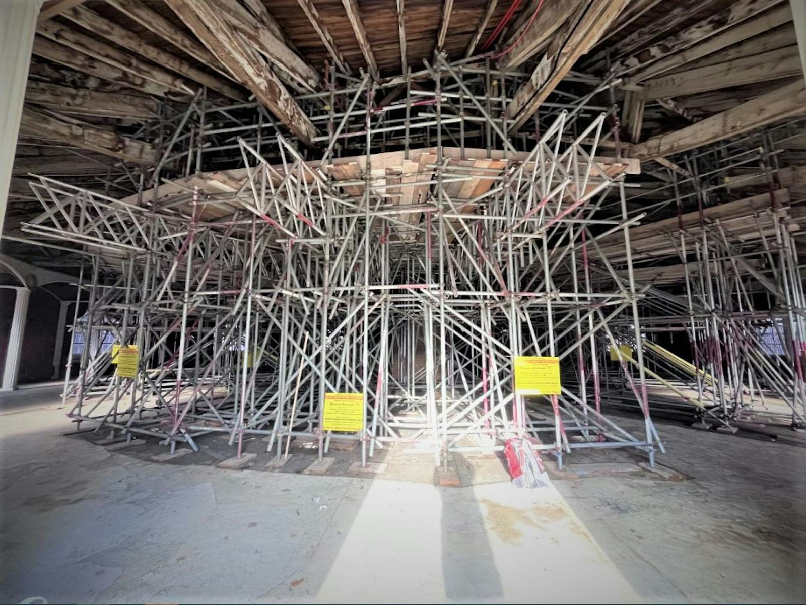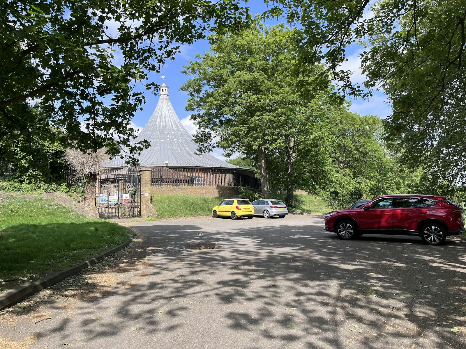 The building is of traditional construction with brick elevations and timber framed roof weathered in lead and arranged over one floor. The main section comprises a 24-sided polygon shaped room beneath the ‘tent’ style roof. There is a rear extension at the north face of the building with a plant room attached. There is a small gatehouse-style outbuilding located at the entrance to the Rotunda compound.
