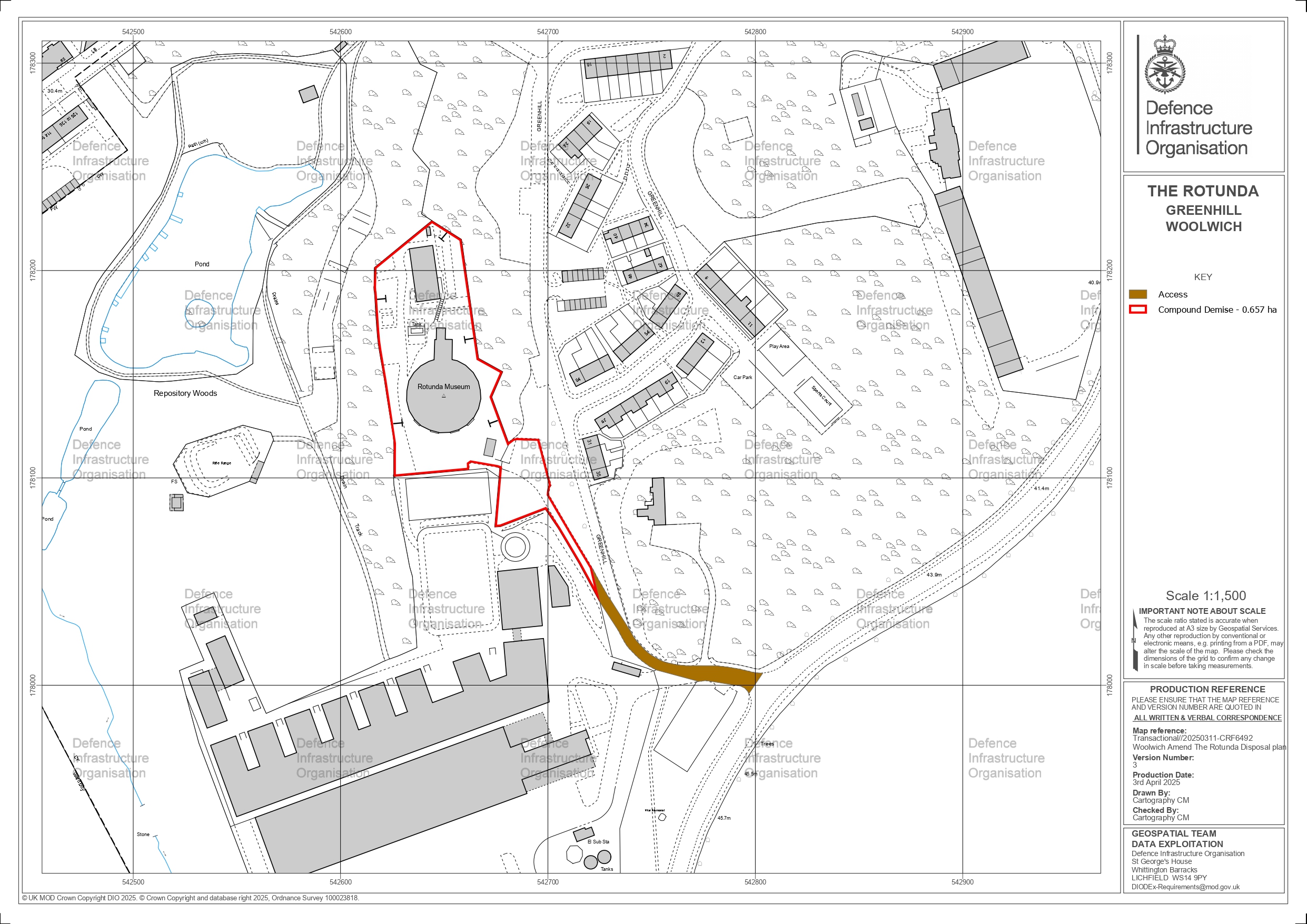 The site is located immediately north of Repository Road, adjacent to King’s Troop Royal Horse Artillery Barracks at Green Hill, Woolwich, London, SE18 4BW, which currently forms part of the wider Royal Artillery Barracks site. The site is located outside of the secure perimeter fence to the main RAB. It is located north of Green Hill Road, which bends round to the north west of the Site. The Site has its own access route and car parking immediately to the south of the building, and there is a residential area located to the north and northeast of the site. The surrounding area is primarily owned and used by the Ministry of Defence.