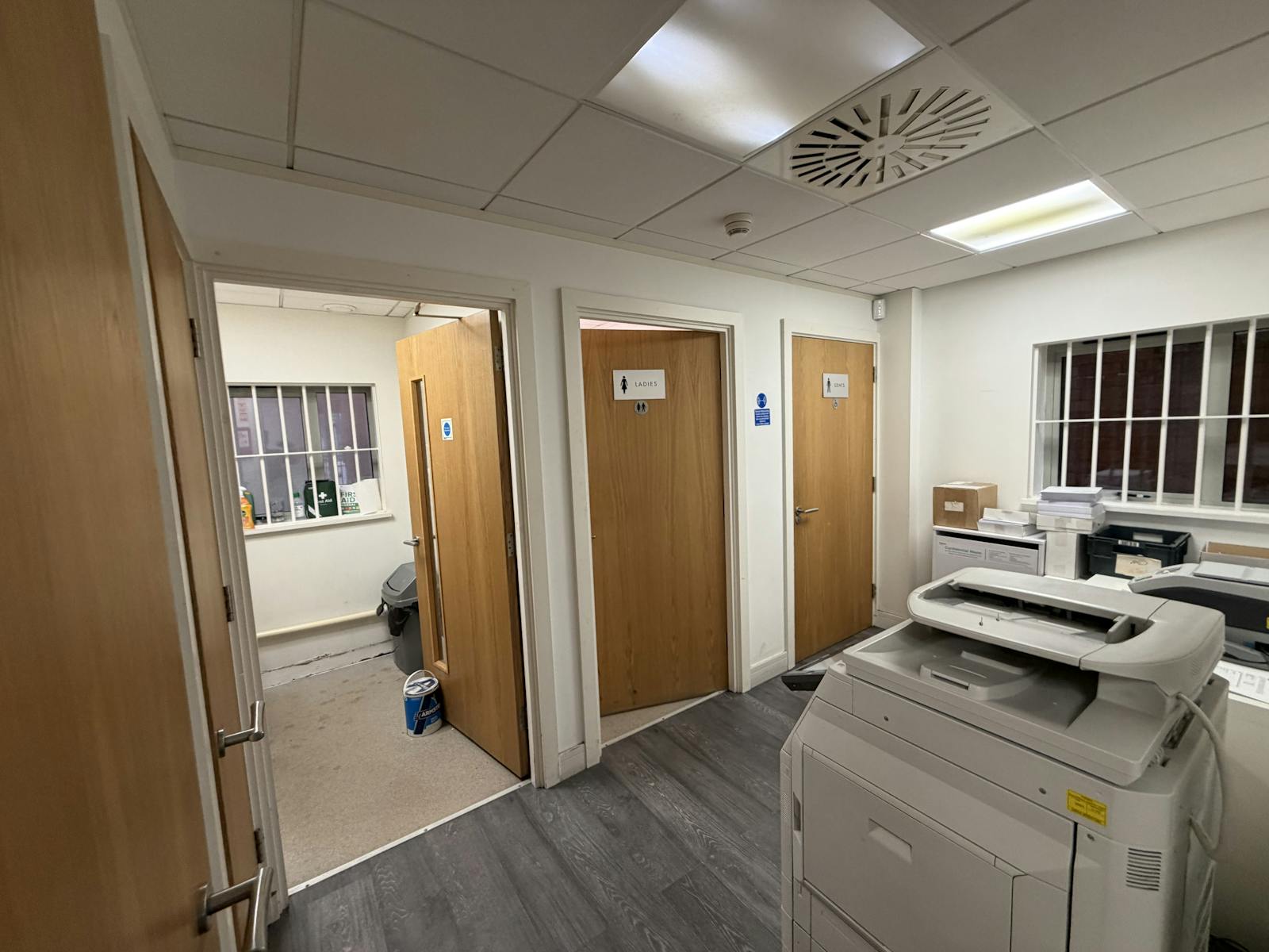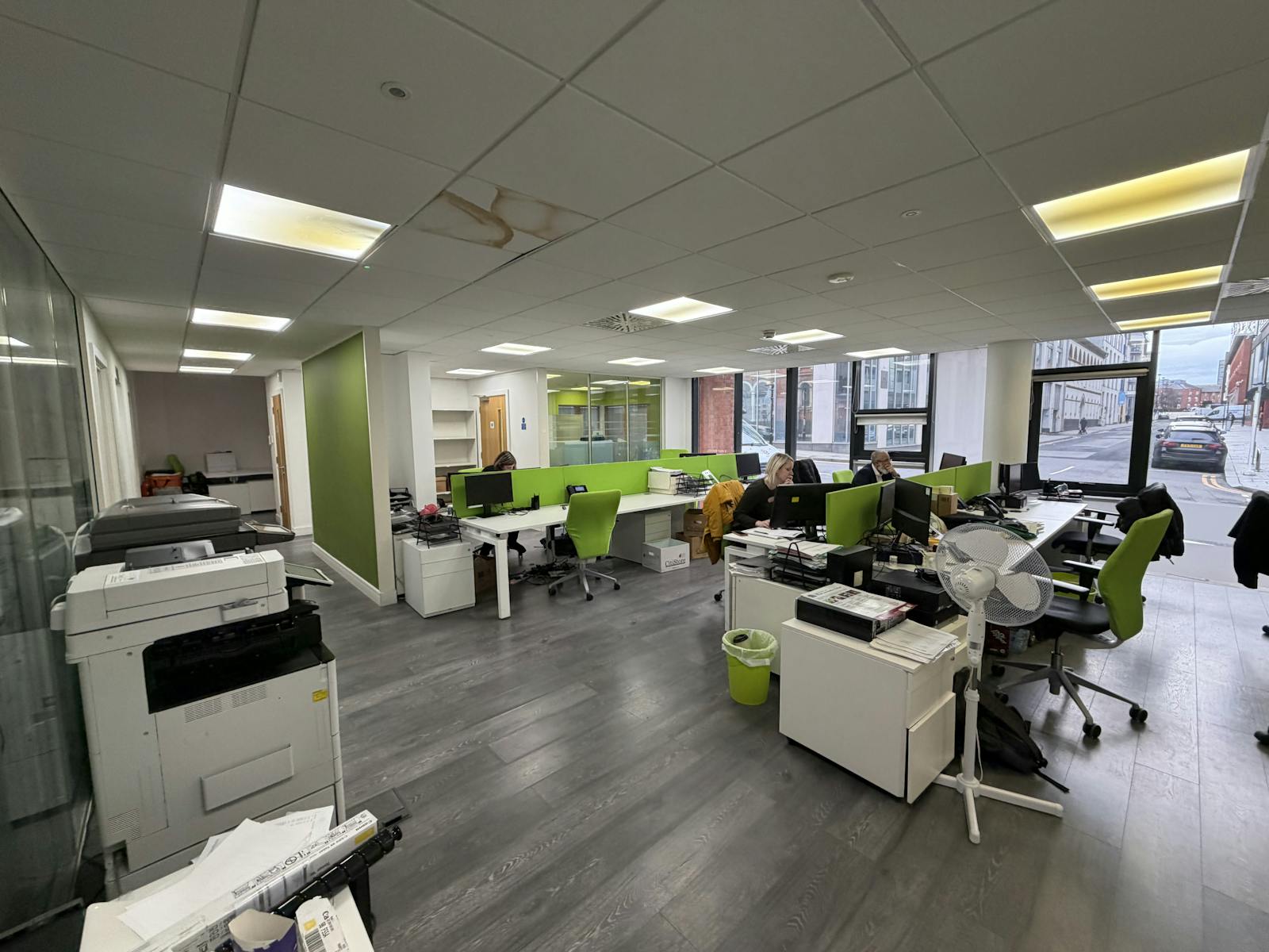 The office accommodation is arranged predominantly in open-plan format, with a meeting room positioned to the front and a larger boardroom or breakout area located to the rear.