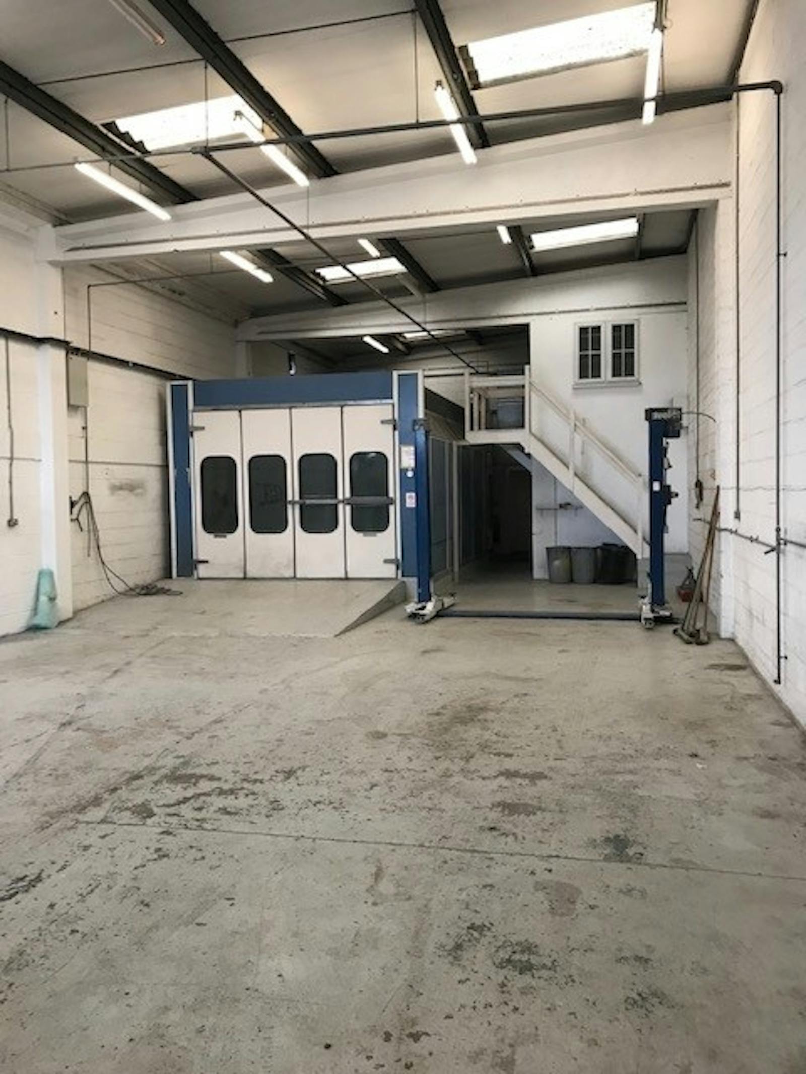 The subject unit comprises one half of a semidetached unit constructed with a concrete portal frame incorporating a pitched asbestos roof with perspex roof lights in part. Main walls are formed of 11 inch cavity brickwork.