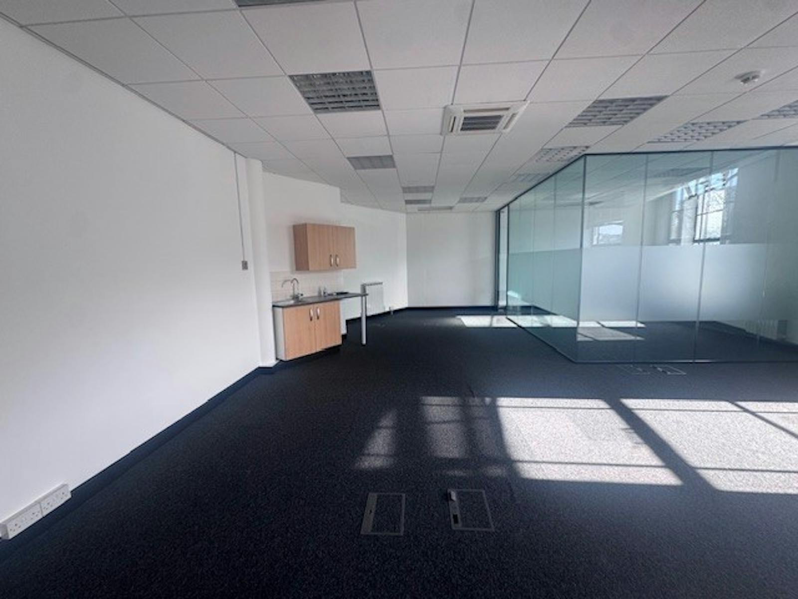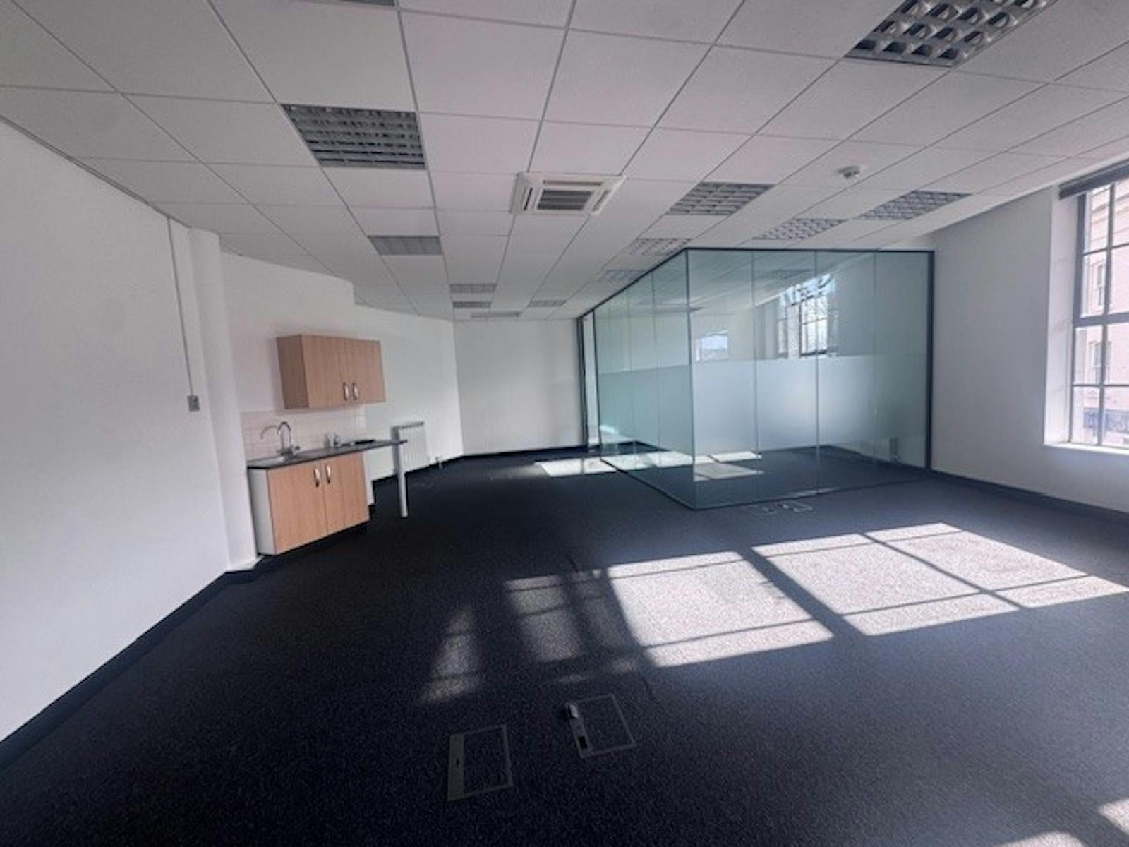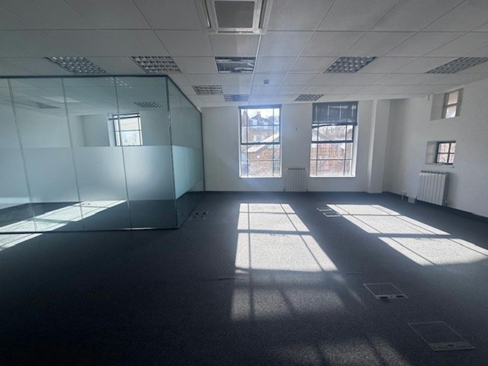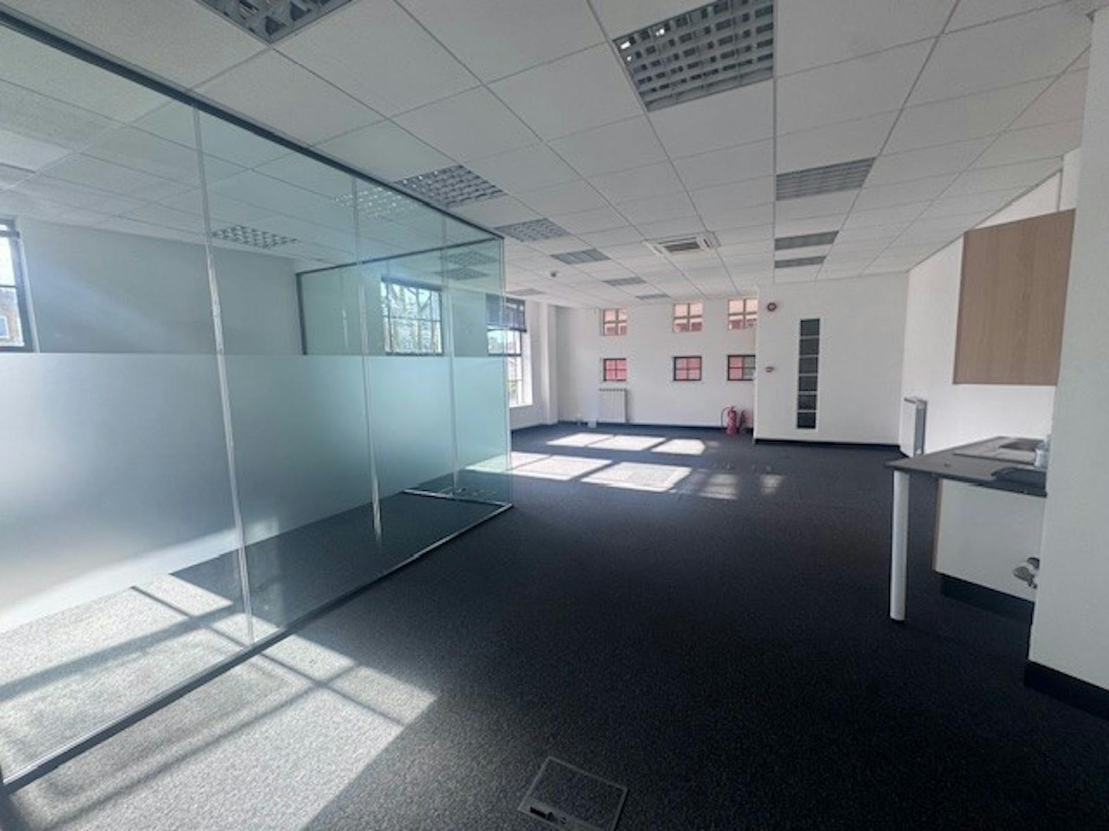 This building offers a recently refurbished office unit on the ground floor. The unit includes a dedicated parking space for one car, ensuring convenient access for both employees and visitors. The unit benefits from excellent natural light, carpet flooring, suspended ceiling and shared communal toilets.