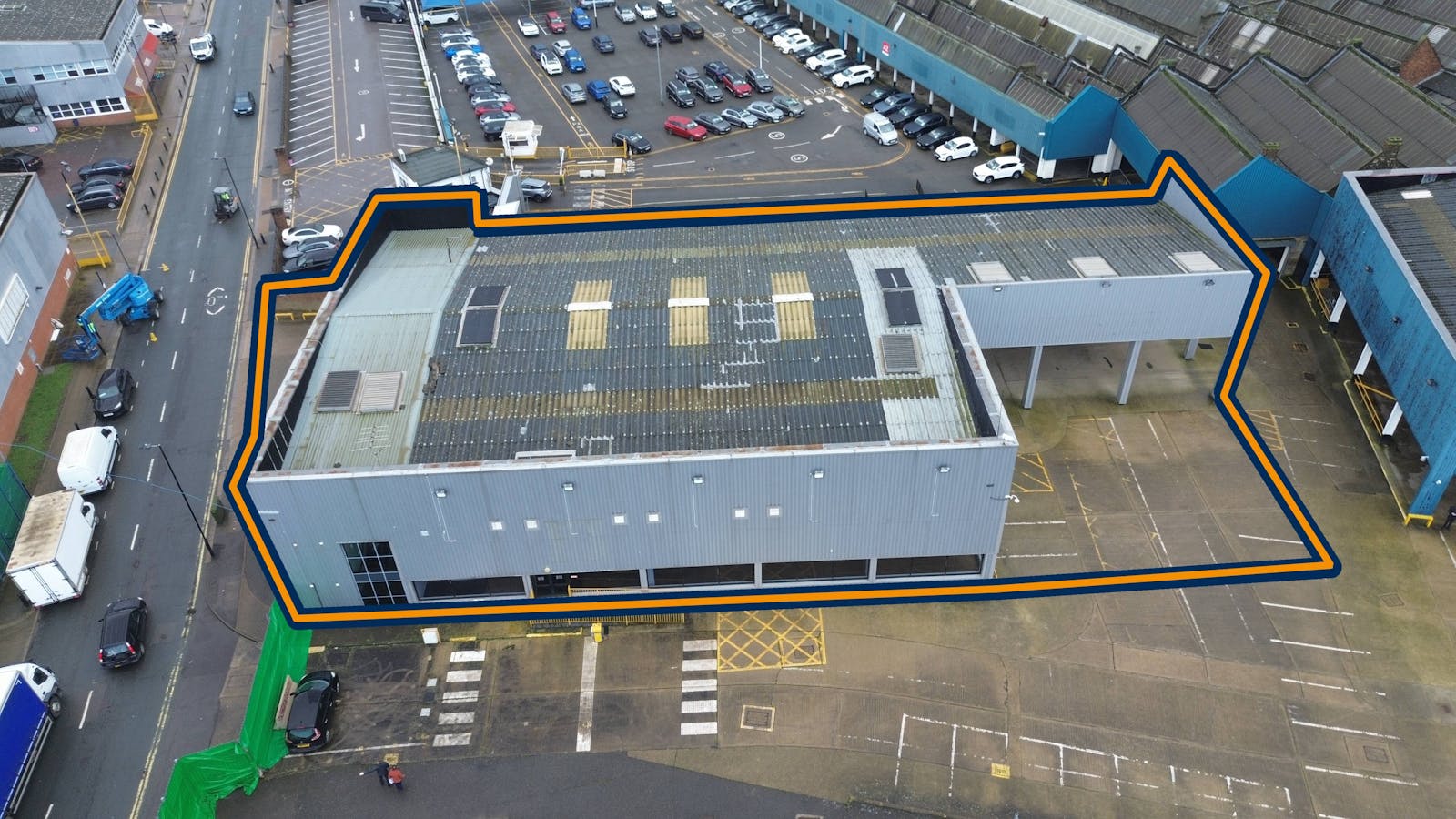 The property extends to 12,627 sqft, comprising 10,867 sqft at ground floor and 1,760 sqft of first-floor offices and amenities, together with a delivery forecourt and parking area of approximately 5,658 sqft, including covered and uncovered areas.