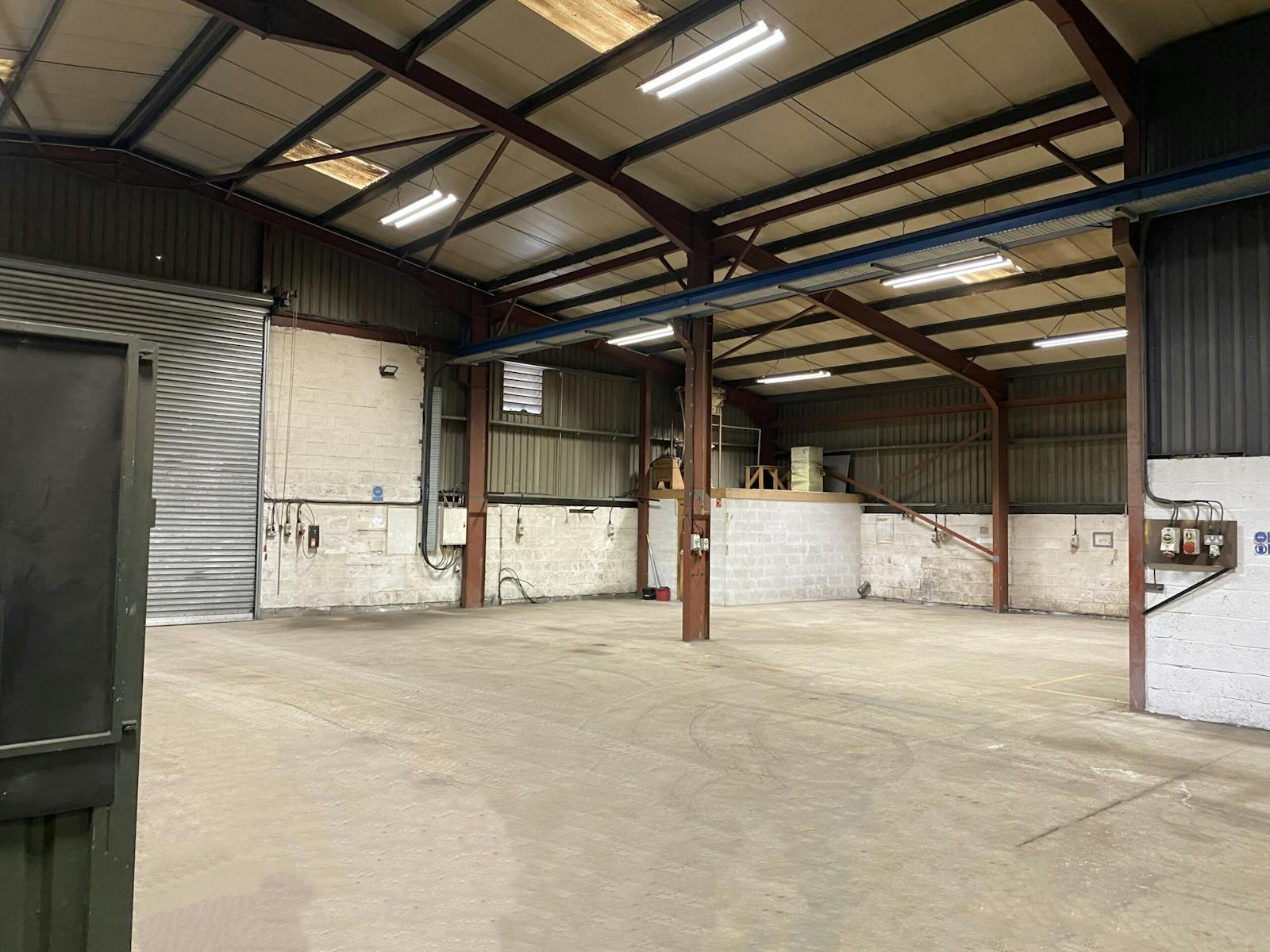 Internally, the workshop is laid to concrete, whilst the walls and ceilings are unlined and finished to the inside face of the external material. The workshop provides an eaves height of 6.25 meters. One 5 tonne travelling gantry cane is in situ. Vehicular access to the workshop is provided via two metal roller doors located on the south and west elevation.
