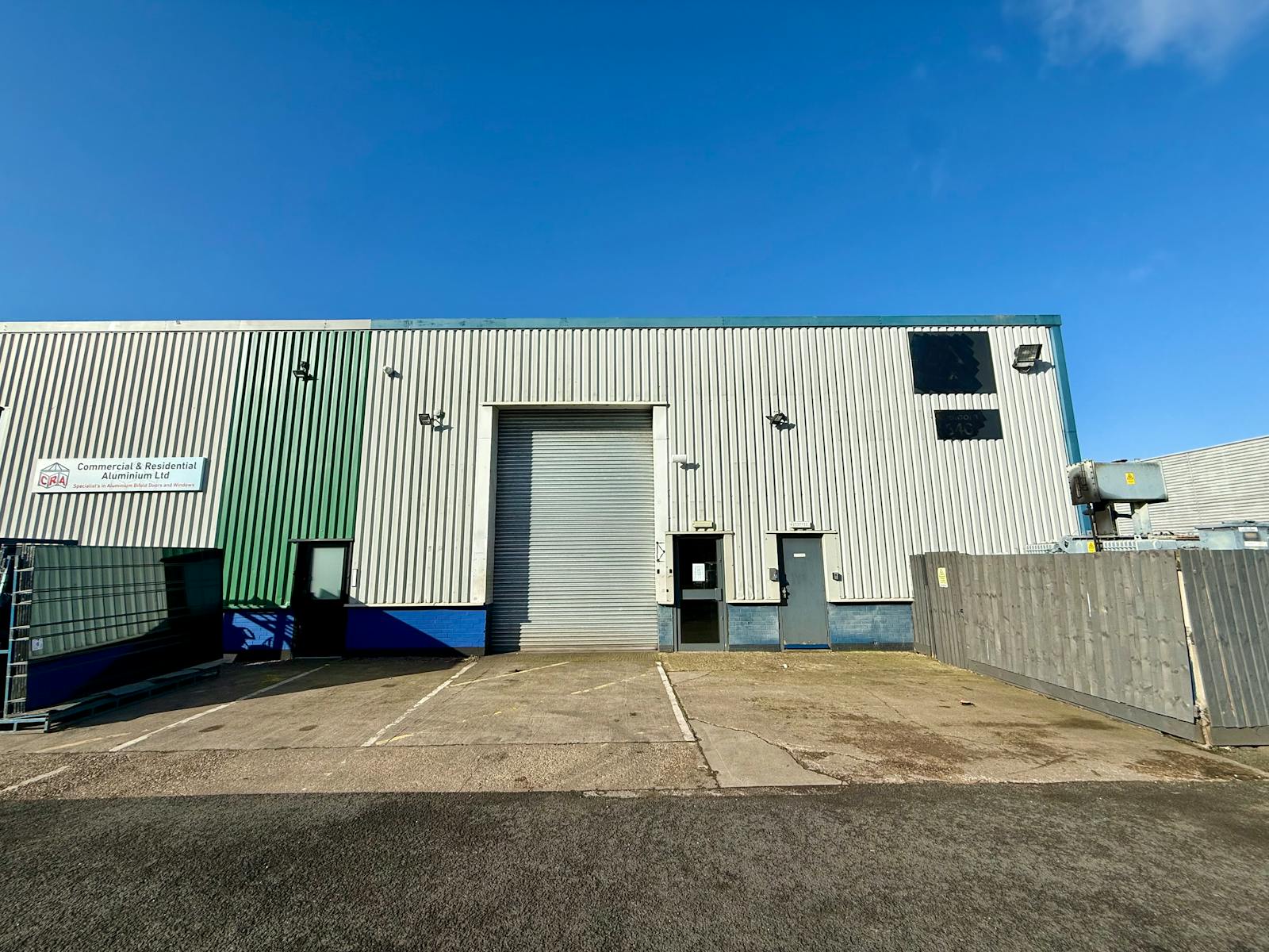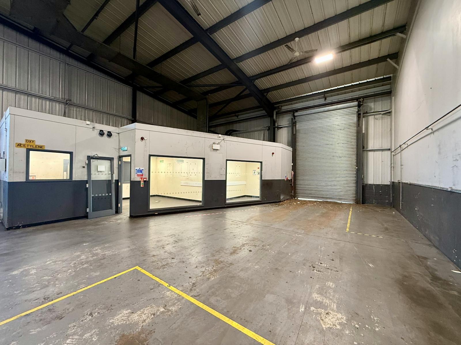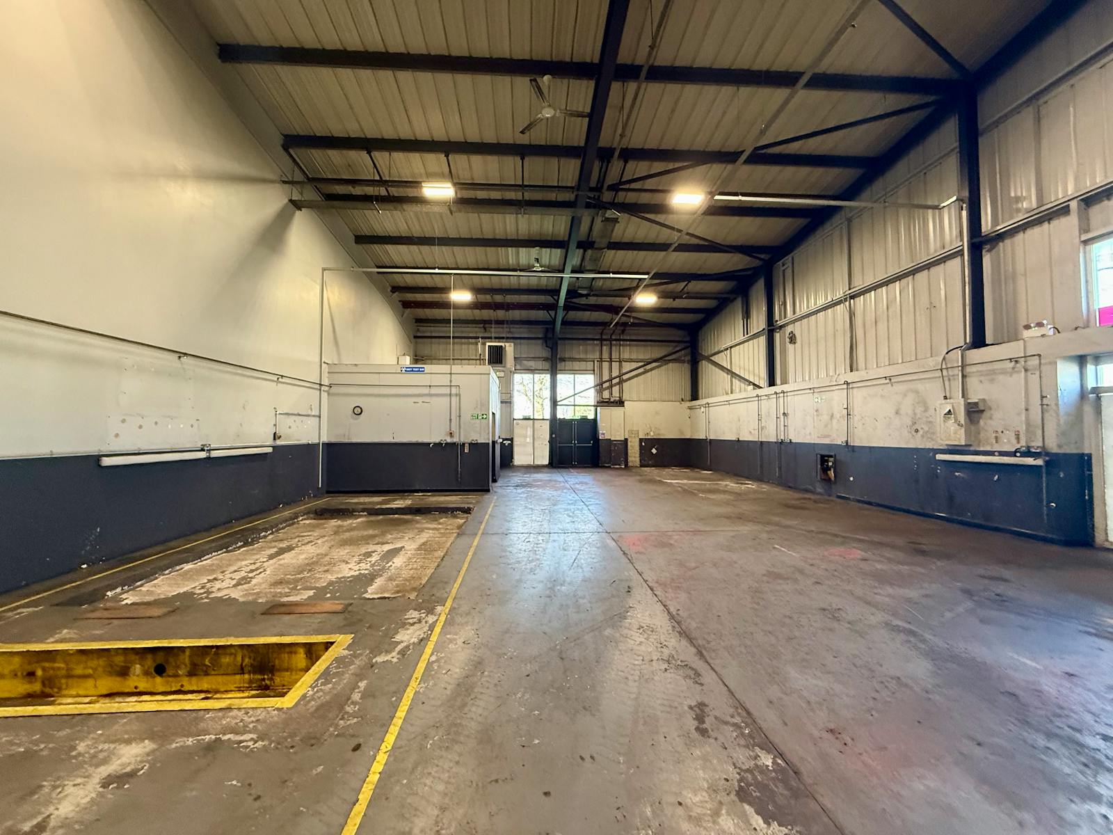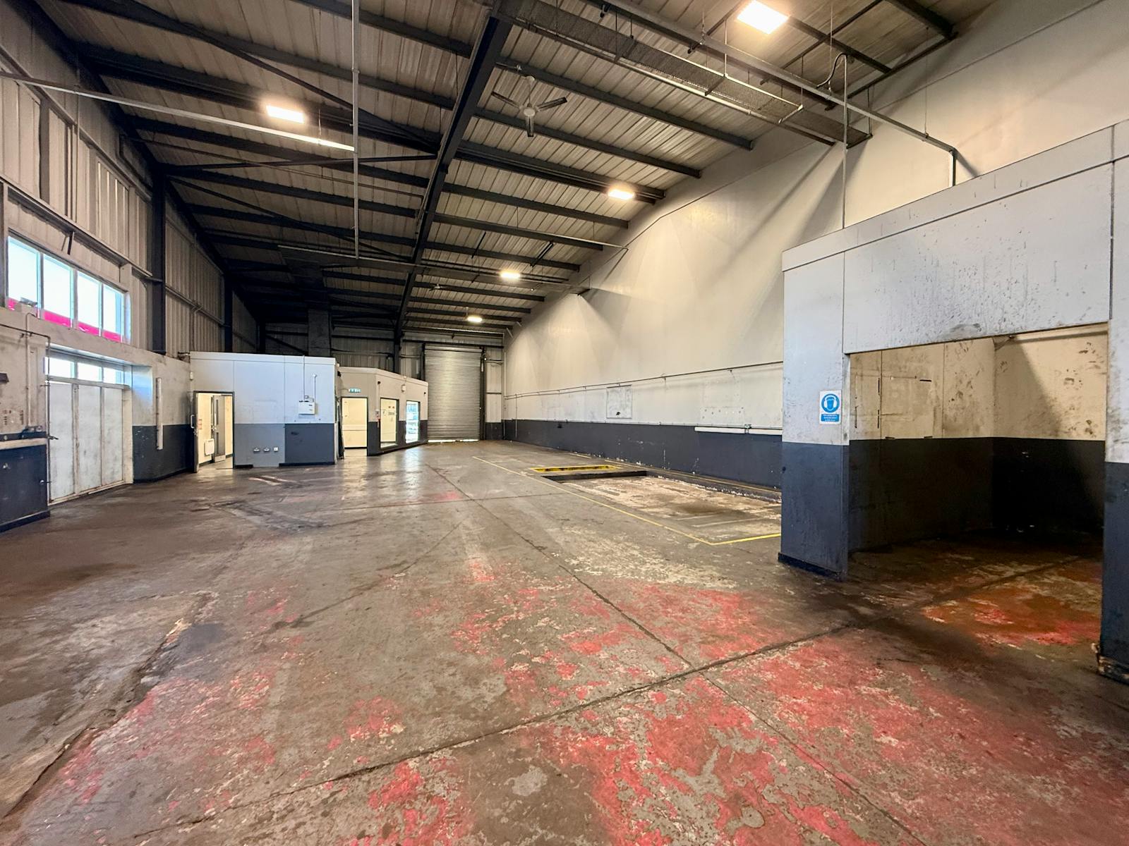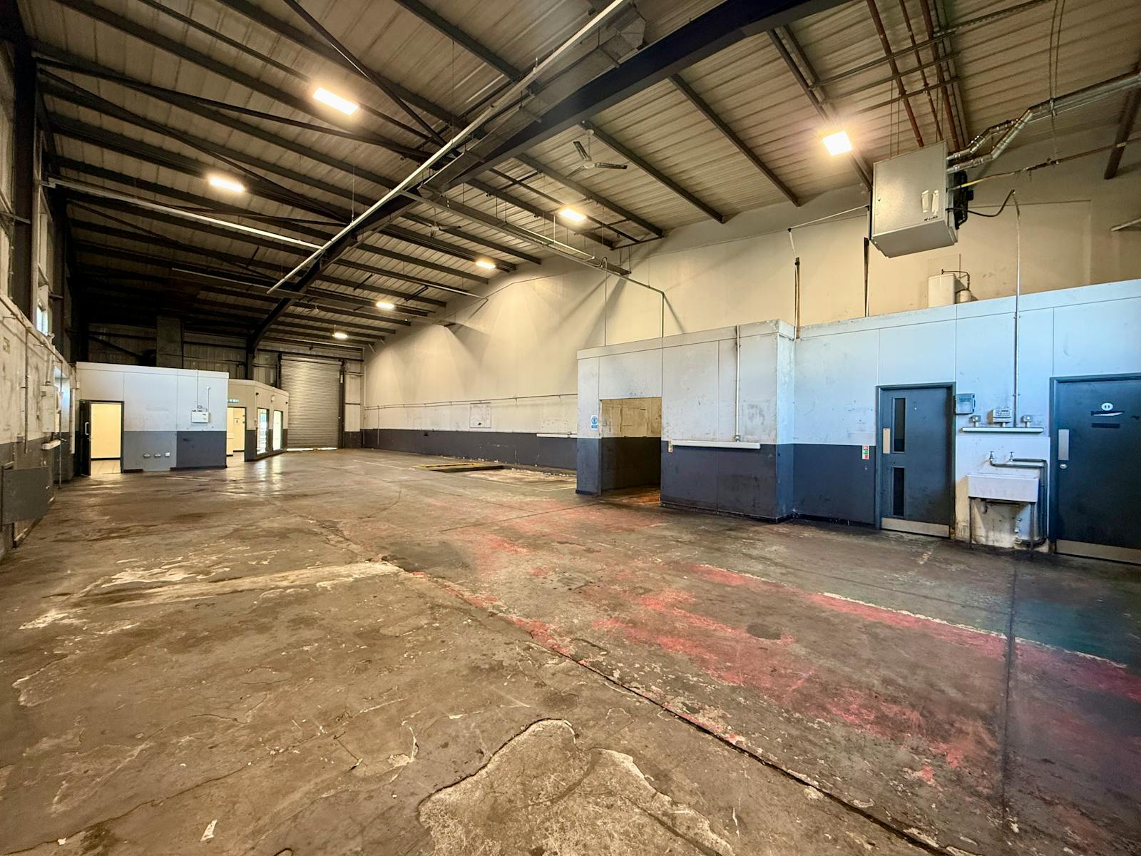 The building benefits from forecourt loading and a level roller shutter access door to the front elevation. Internally, the accommodation provides open span warehouse space with excellent working height, concrete flooring, three-phase power and high-bay lighting.