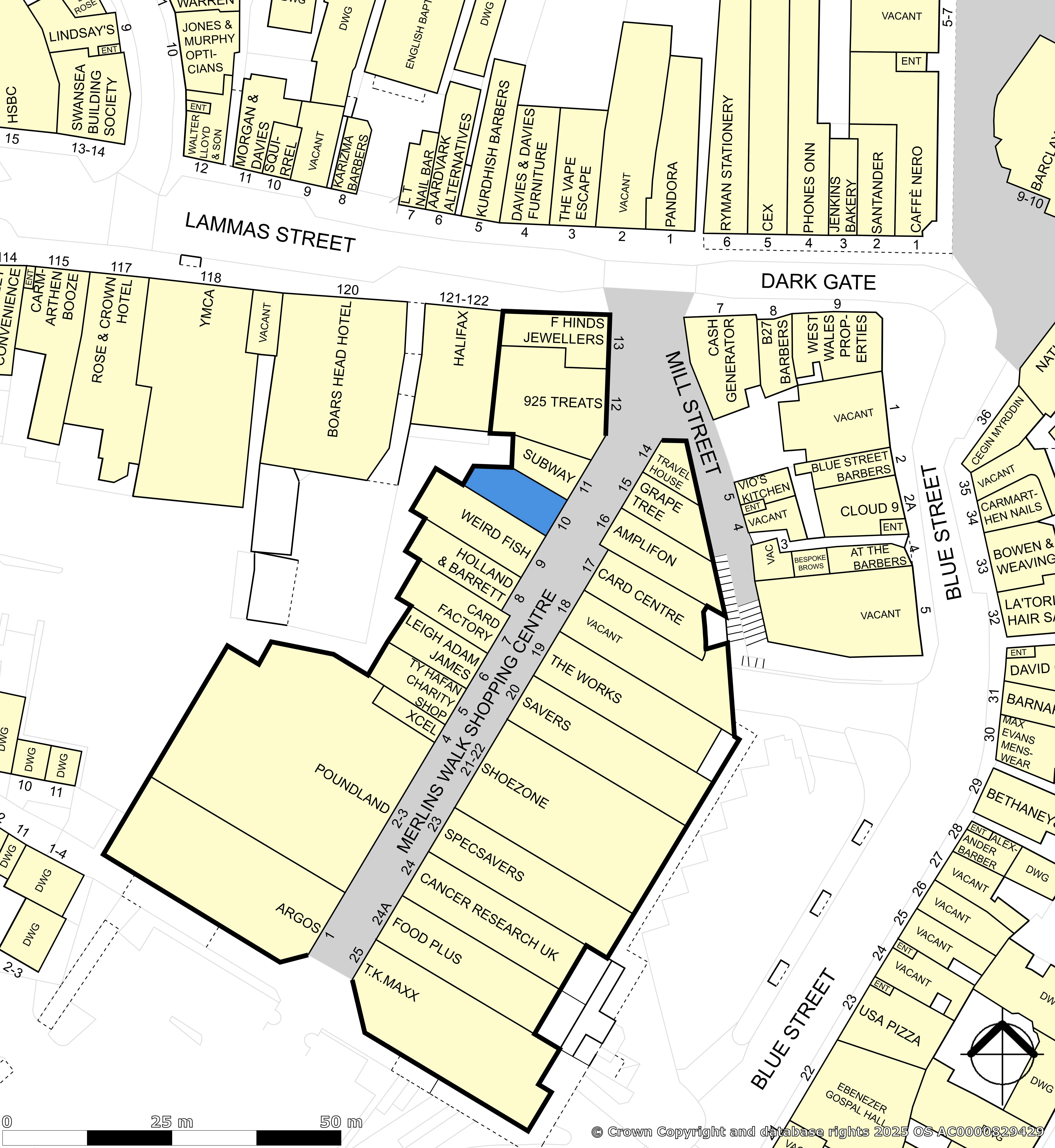 The premises occupies a prime position within Merlin’s Walk, close to one of the town’s main car parks with space for 350 vehicles. Occupiers within the scheme include Specsavers,Holland & Barrett, Savers, Poundland, Argos and TK Maxx. Adjacent occupiers are Weird Fish and Subway.