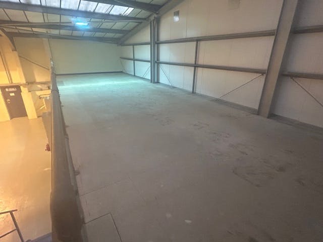 The remainder of the ground floor is open plan warehouse or production space with high bay lamps and a gas fired warm air blower.