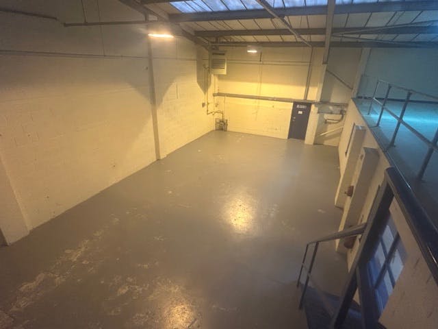 From the warehouse, stairs lead to the mezzanine floor suitable for storage and a partitioned office / rest room, with carpet floor covering, fluorescent strip lighting and wall mounted electric heating.
