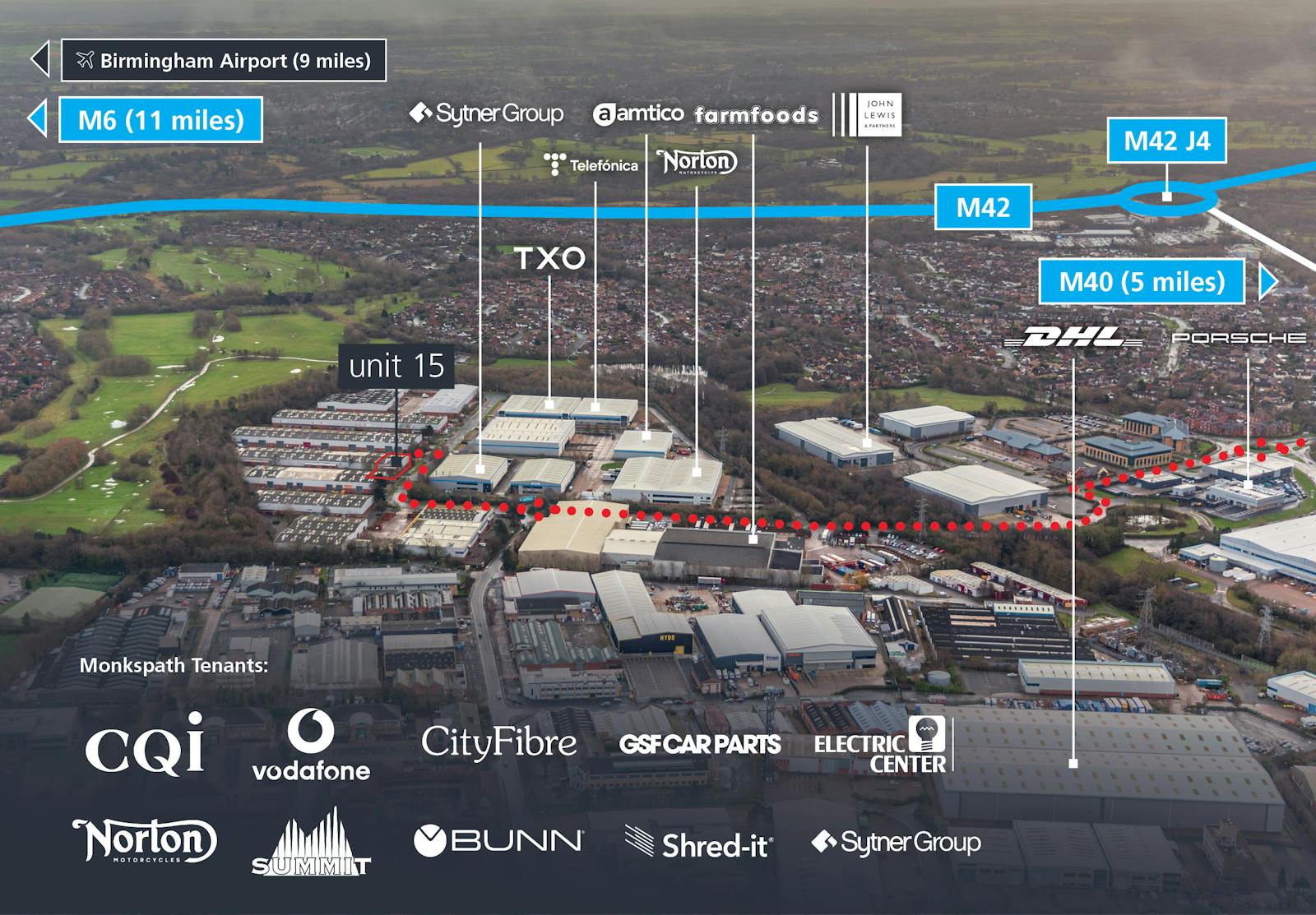 Monkspath Business Park is situated on Highlands Road, Solihull, off the A34 Stratford Road. The A34 provides direct access to Junction 4 of the M42, 1 mile to the south east and Birmingham City Centre, 8.5 miles to the north east. Solihull town centre is 3.5 miles to the north east and is accessed via the B4102.
