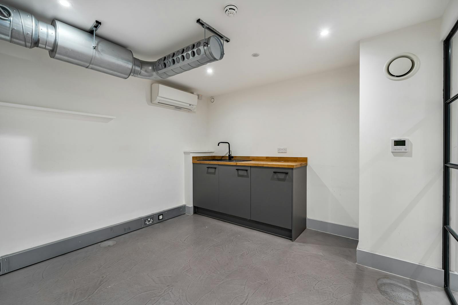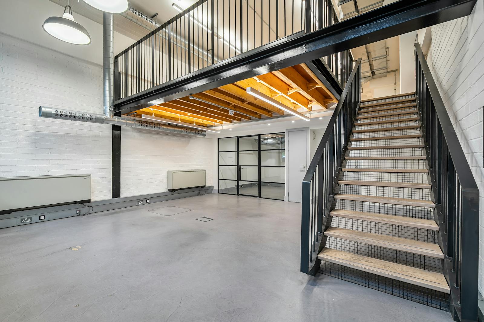 Concrete flooring with built in meeting rooms and a mezzanine floor with timber floorboards adding to the contemporary modern warehouse aesthetic. Being on the ground floor the studios would be perfect for any retailer or office user.