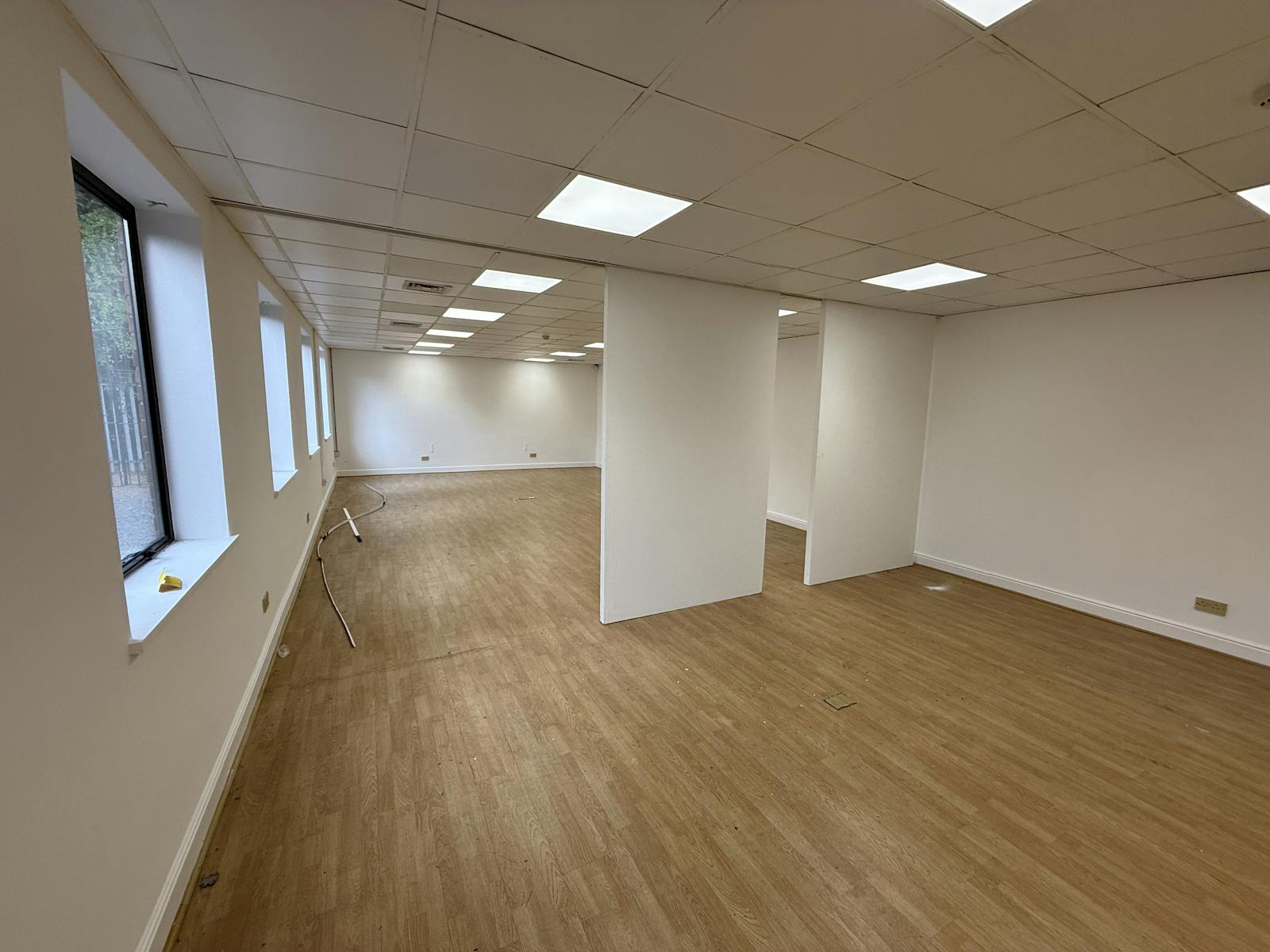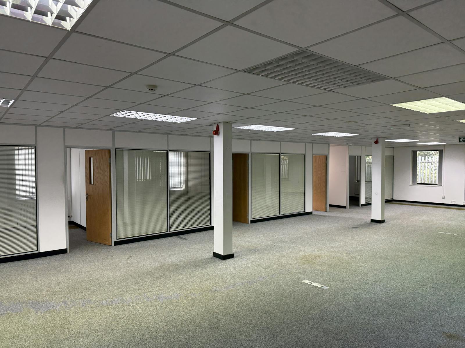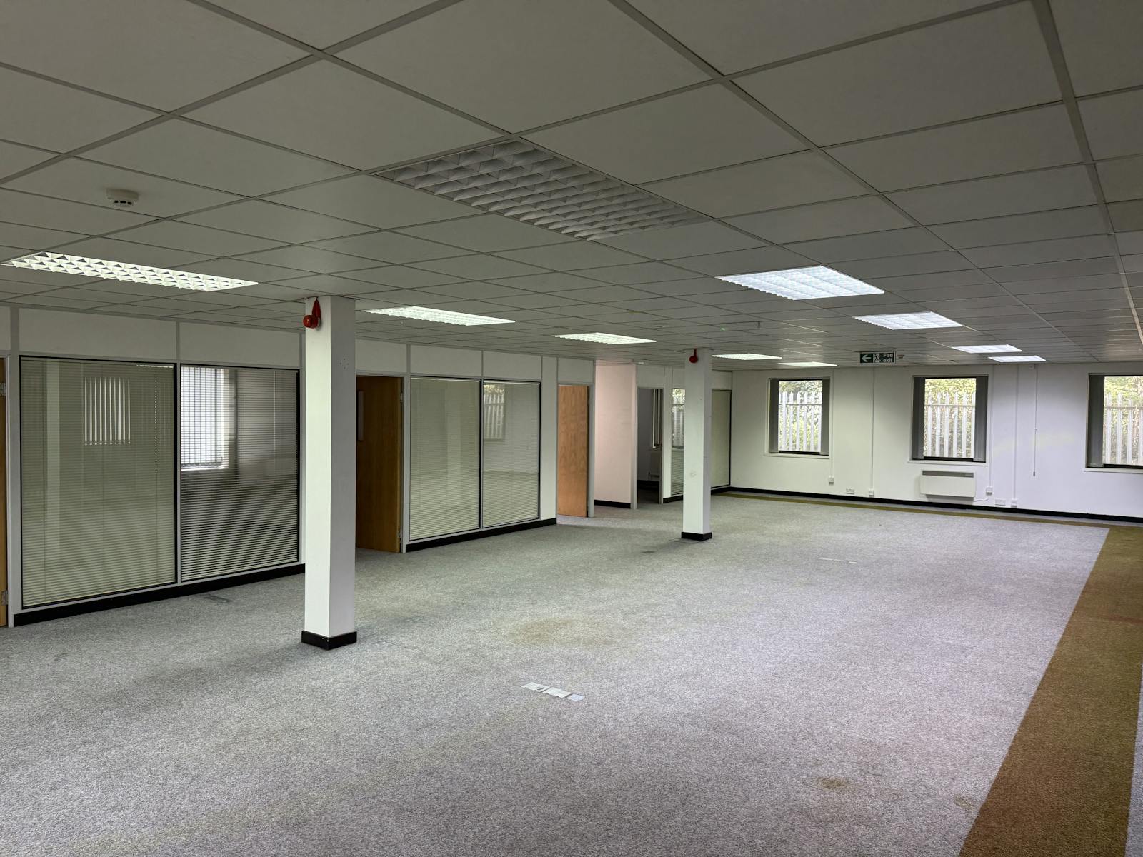• Offices – Main open-plan Office, with Private Offices to perimeter. Measuring 37’6” (11.43m) x 73’6” (22.41m). Fitted to a decent standard, incorporating suspended ceilings with inset fluorescent lighting and heating by metal radiators connected to a gas-fired boiler.
