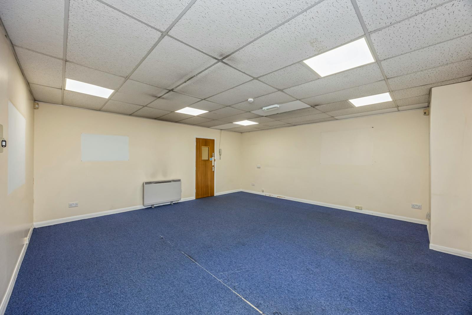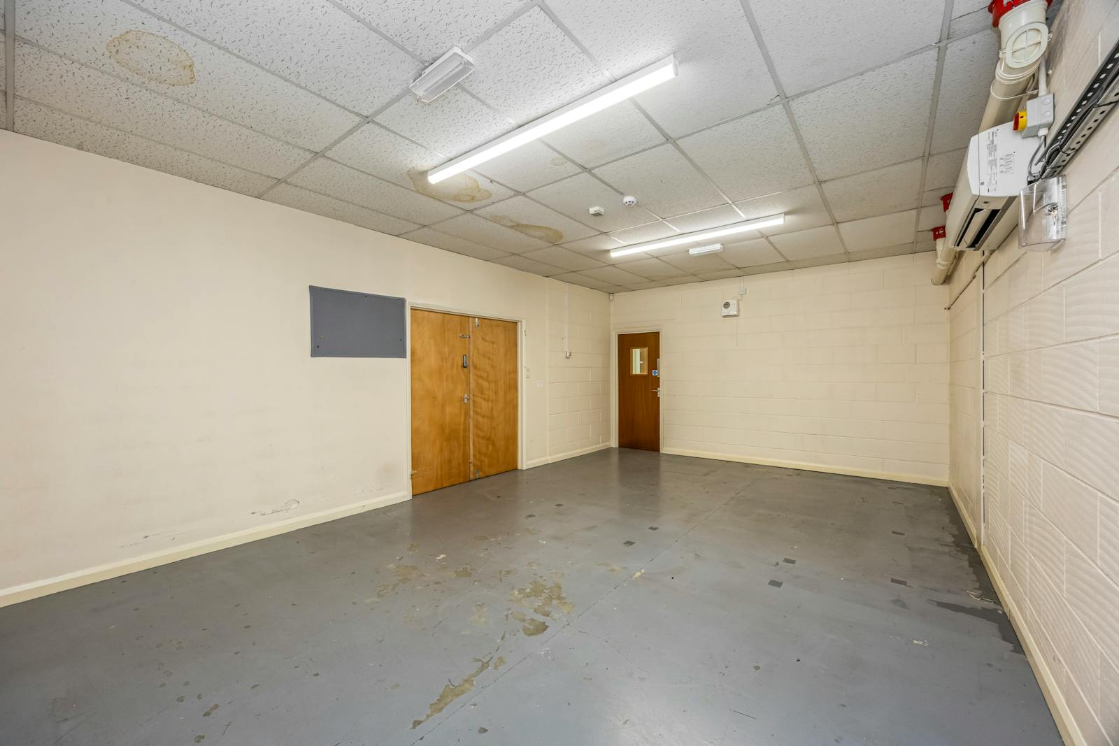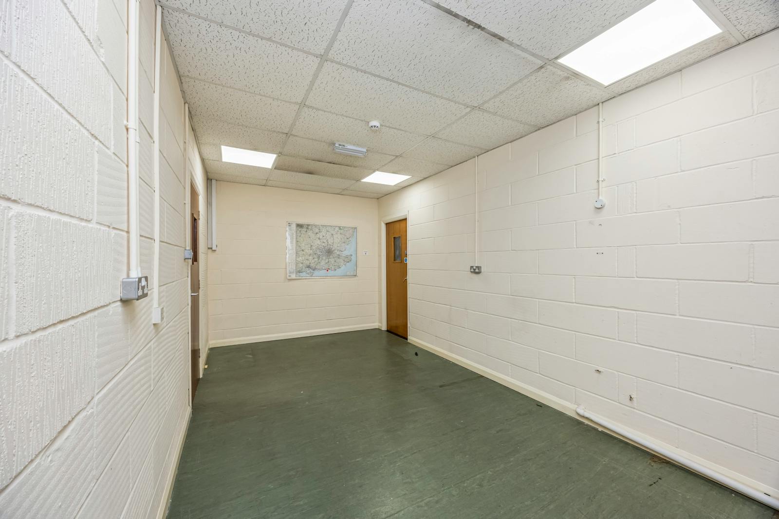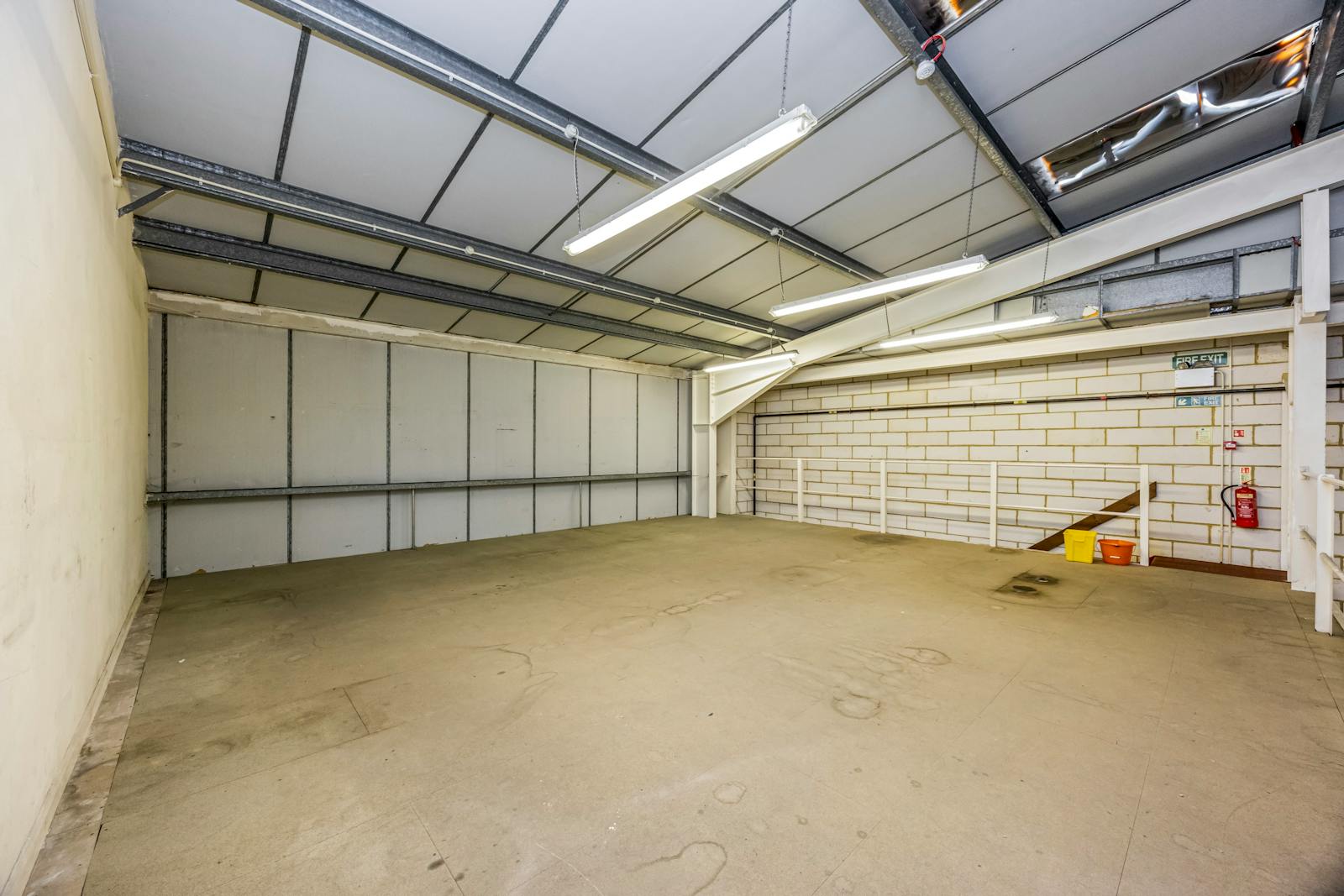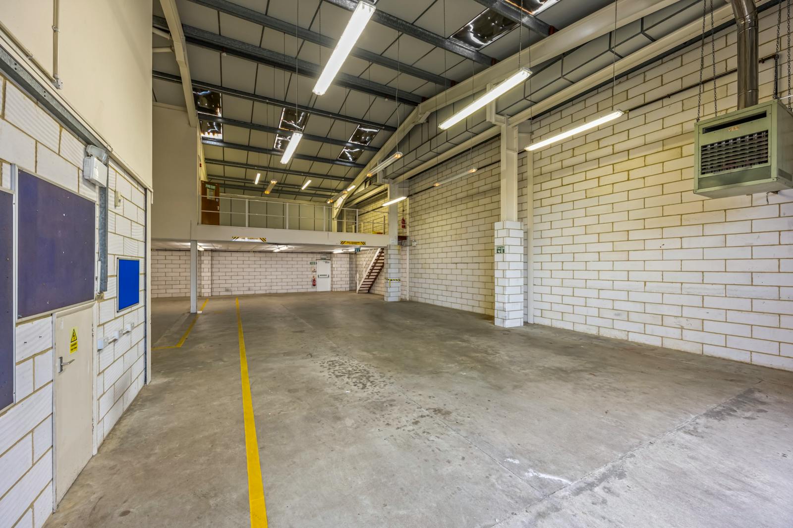 The first floor provides well-presented office accommodation, including three partitioned offices, a kitchenette, and two WCs. The ground floor comprises open-plan warehouse/production space with a minimum eaves height of 5m at the rear (rising to 8m), concrete flooring, strip lighting, gas-fired hot air blower, and an electric roller shutter loading door (approx. 4m x 4m). There are two internal store rooms and a WC, along with a high-quality steel-framed mezzanine (forming part of the original build), providing additional storage capacity.