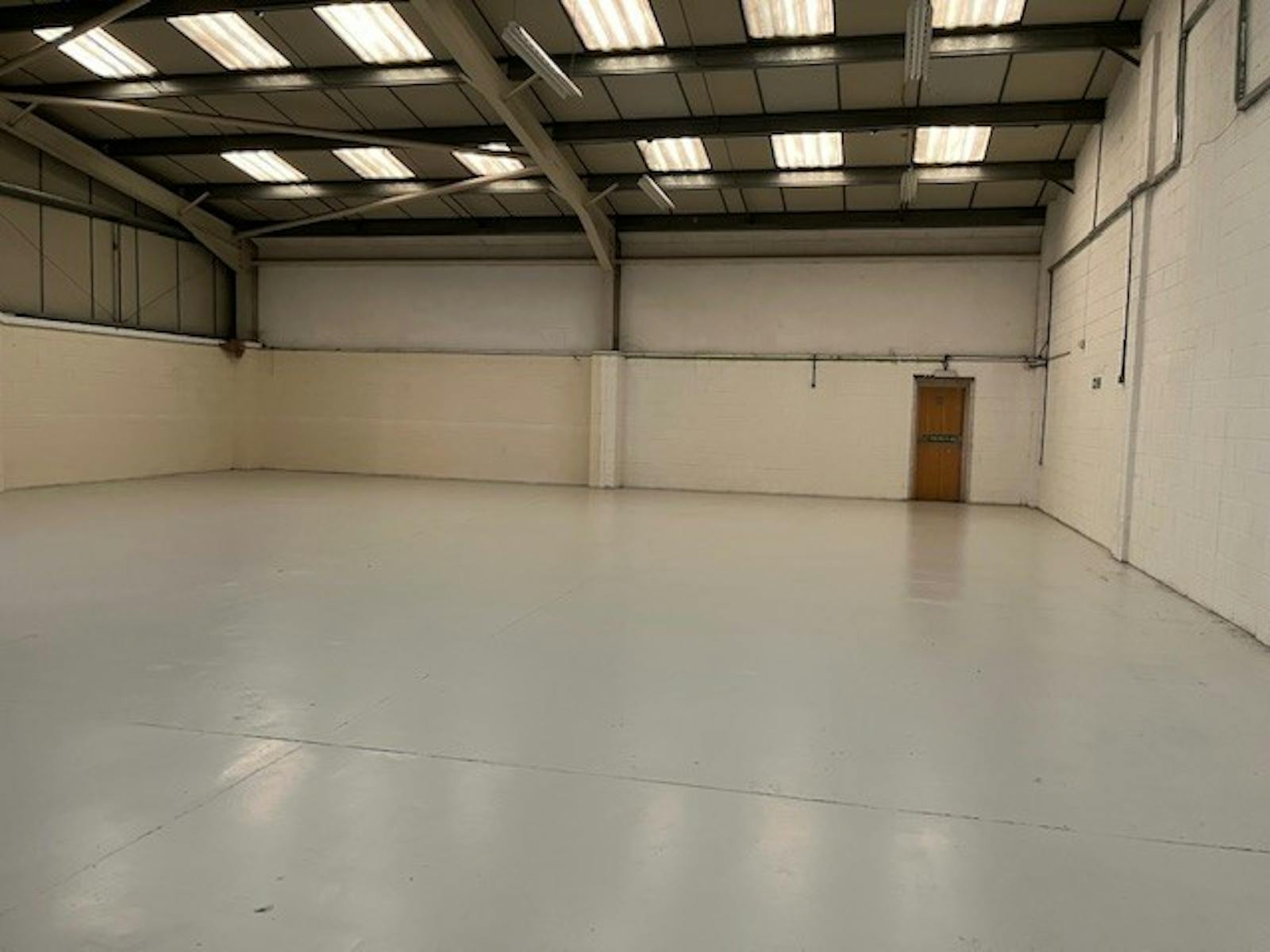 Internally, the unit provides an open-plan warehouse including a concrete floor, lighting, and an eaves height of approximately 4.1 m, rising to an apex of 5.8 m. Access is provided via a manual roller shutter door measuring approximately 3m (W) x 3.5m (H) to the front elevation. The accommodation also includes a ground floor office, accessed via a separate pedestrian entrance, along with kitchen and WC facilities.