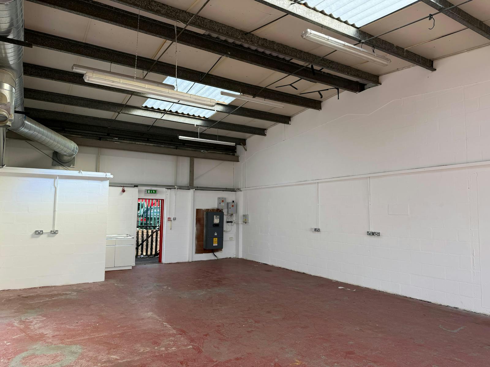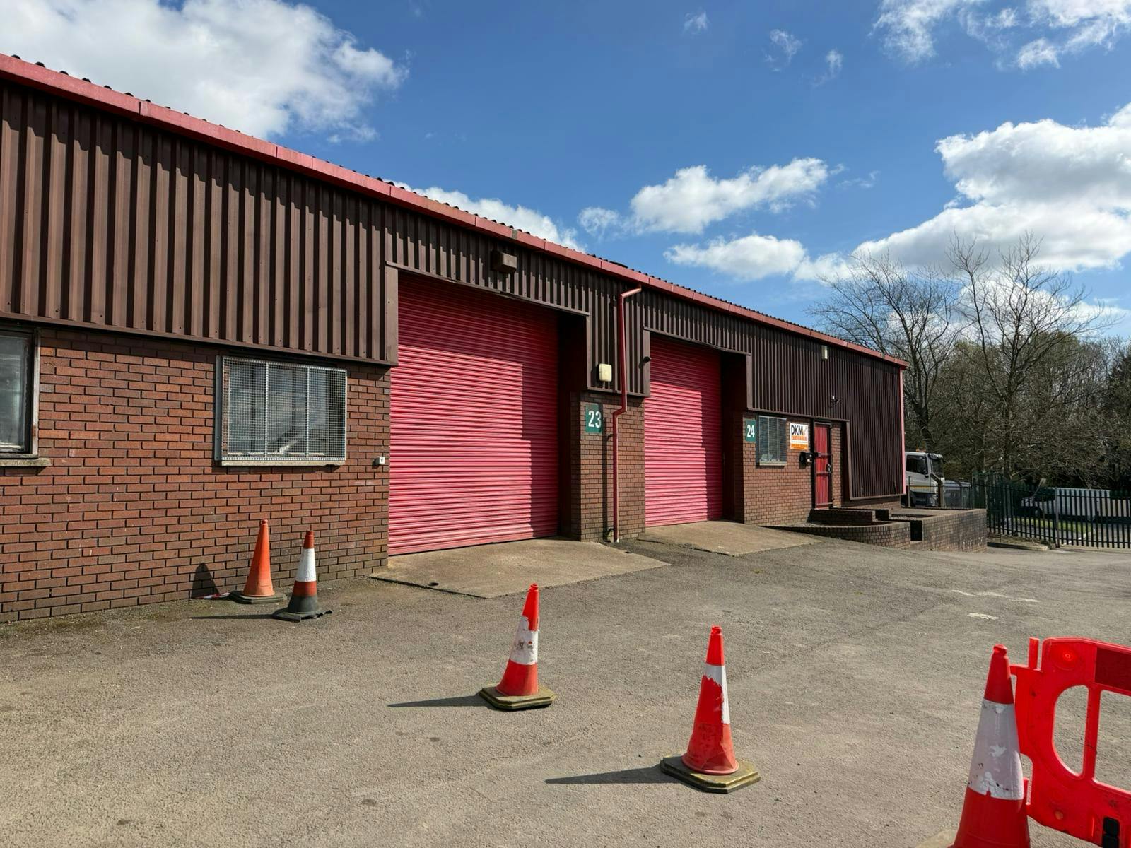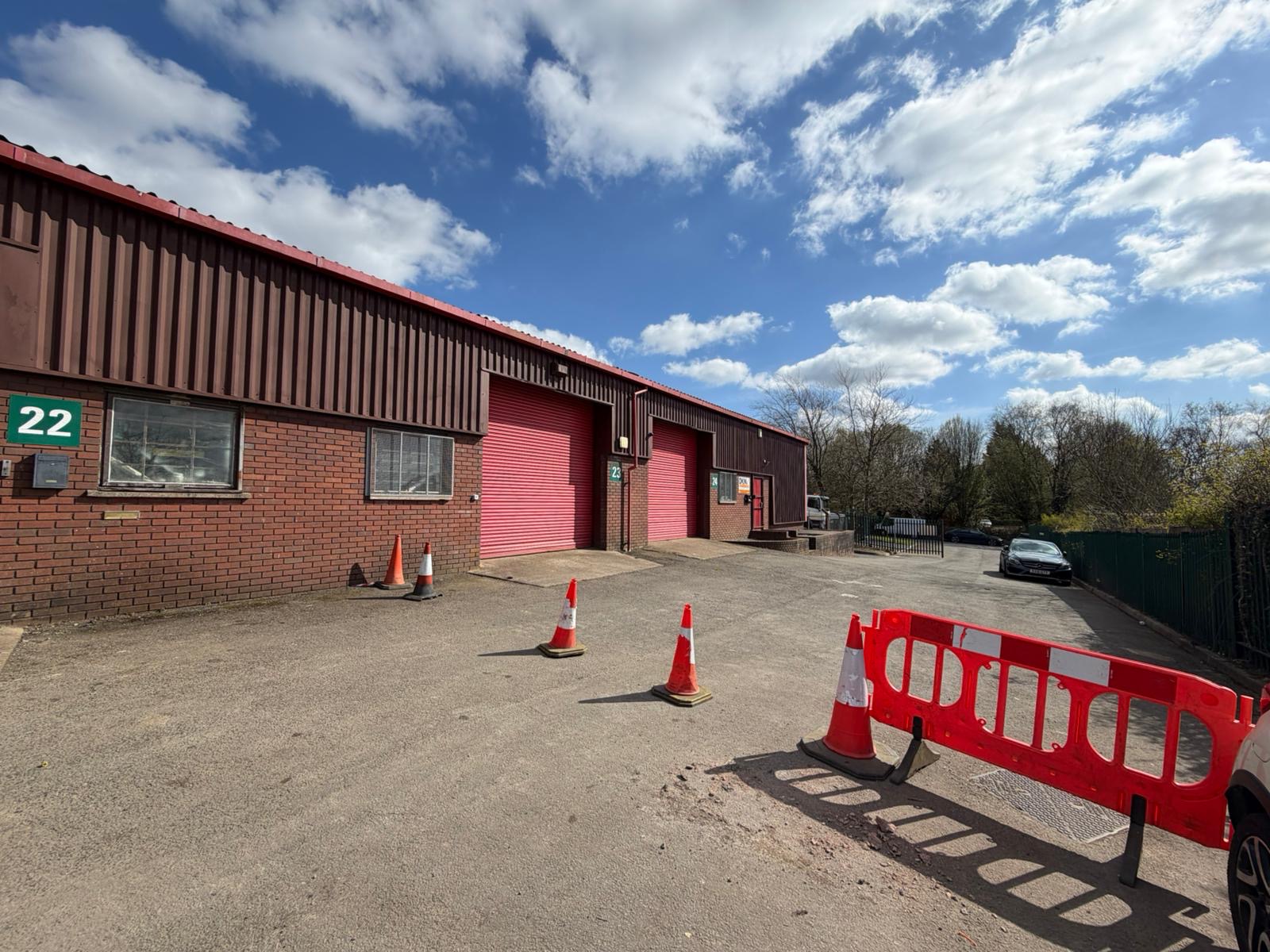 Mid terrace Industrial Unit of steel portal frame construction with brick/block elevations, which are part clad with sheet steeling.