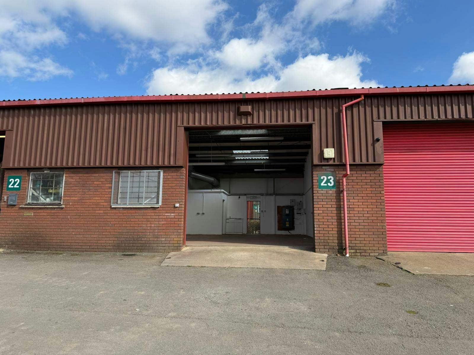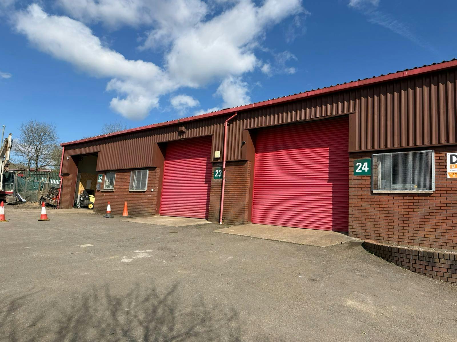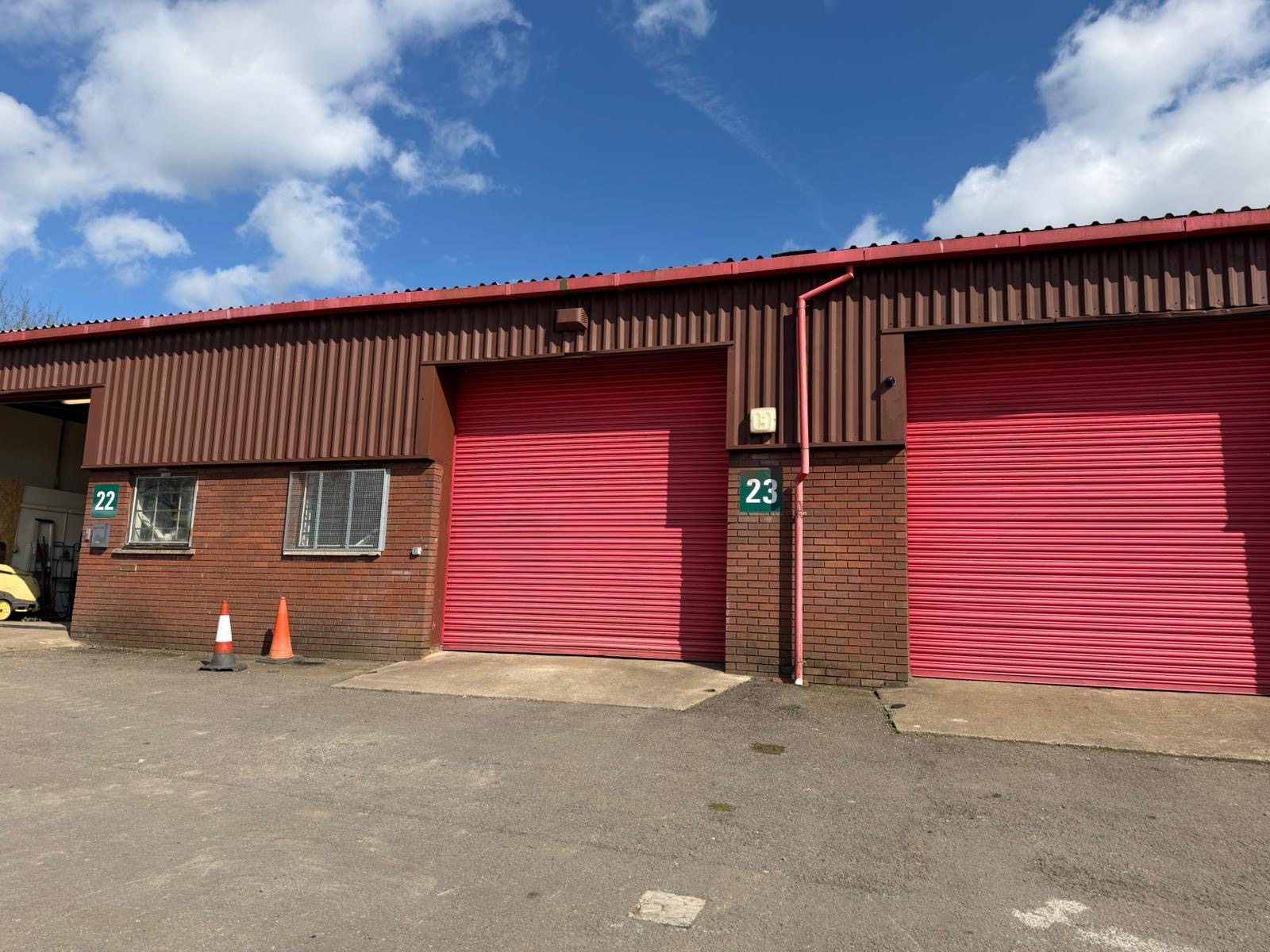Mid terrace Industrial Unit of steel portal frame construction with brick/block elevations, which are part clad with sheet steeling.