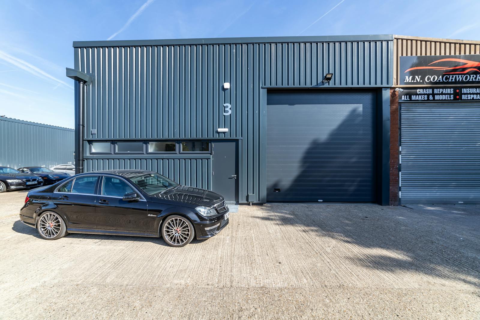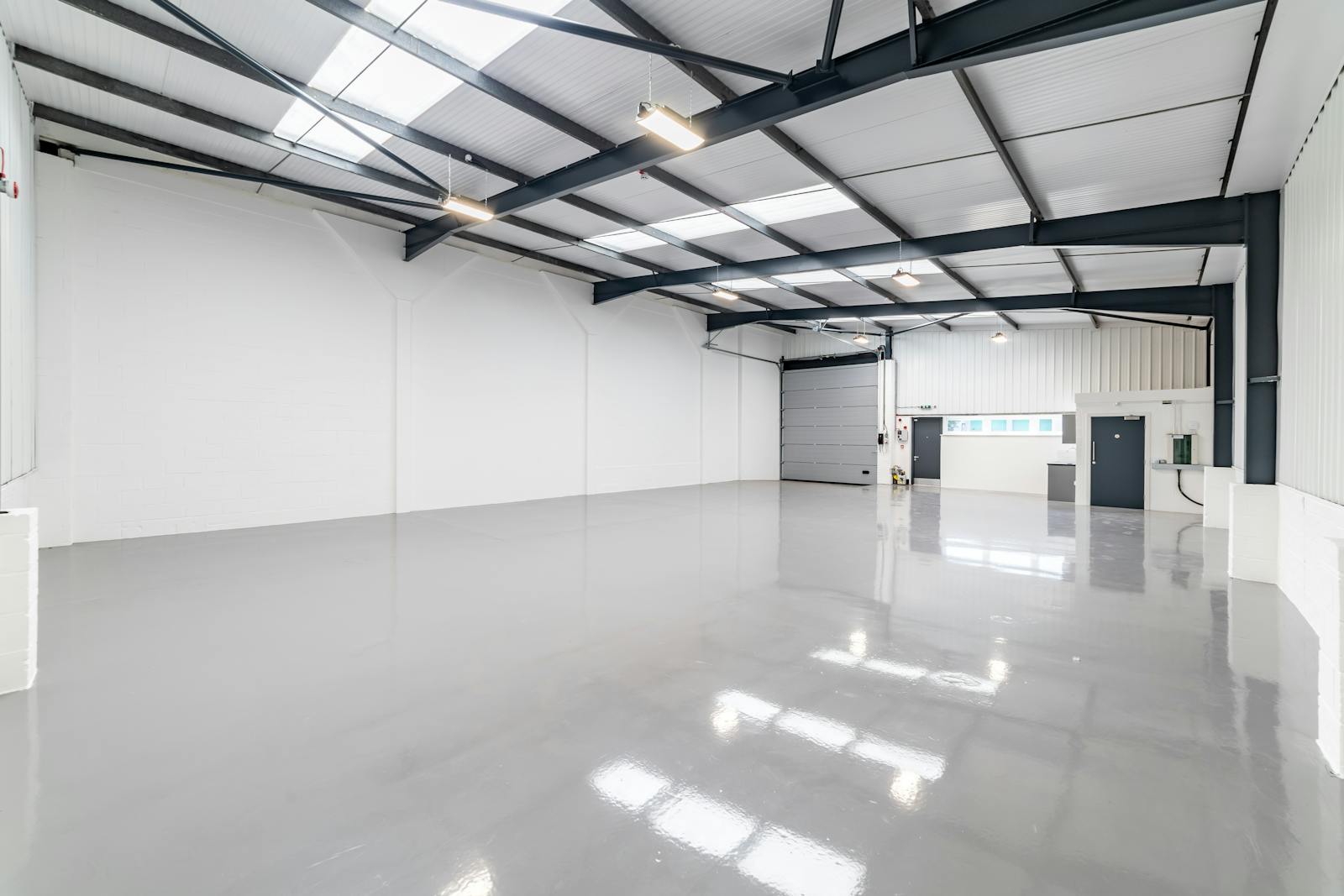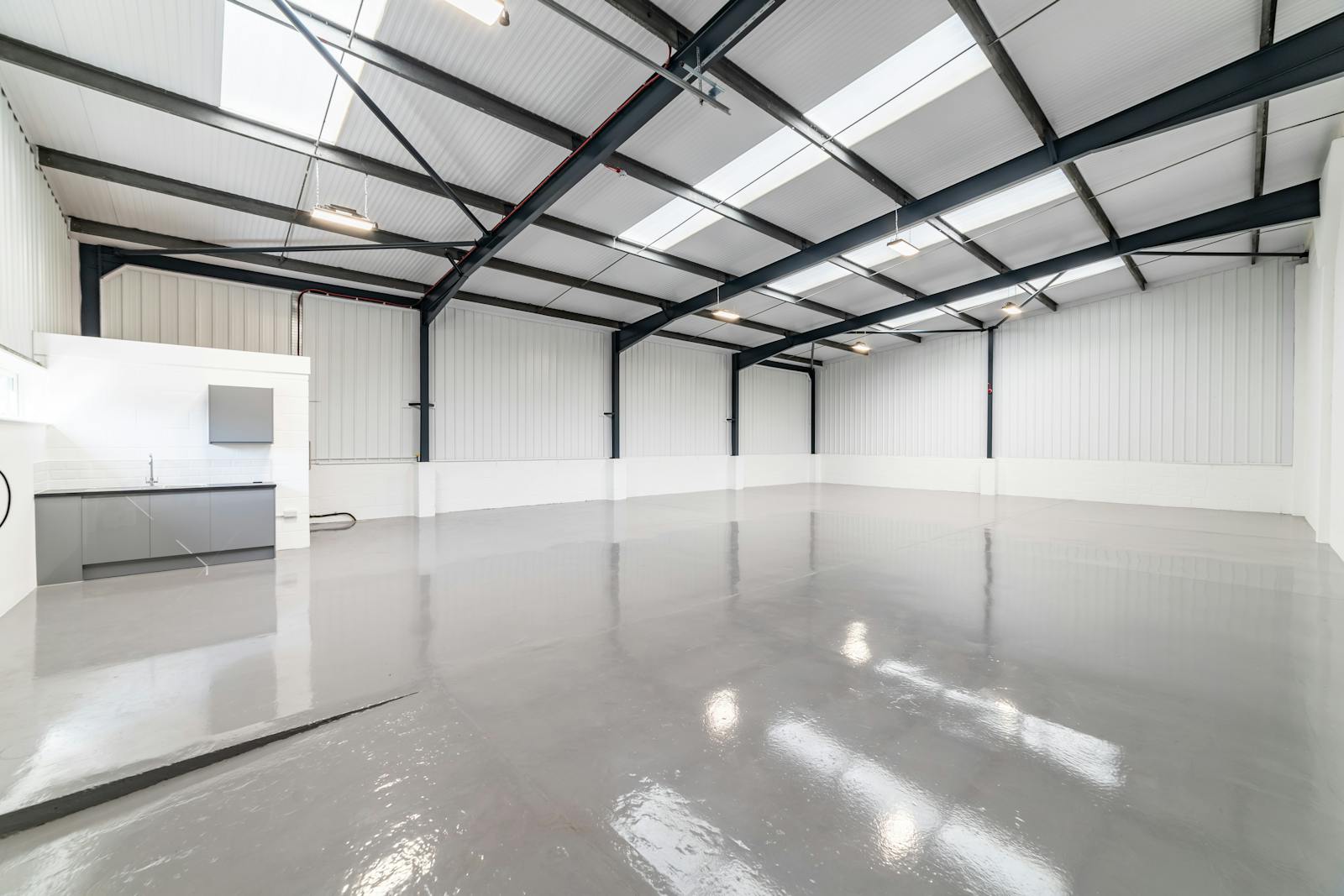 Terraced steel portal framed trade counter/ warehouse units with part brick, part new profile sheet metal clad elevations to a mono-pitched roof. The warehouse area benefits from a clear open-plan layout with access via an electric roller shutter door serviced by a dedicated loading bay. Recently refurbished to a shell finish with disabled WC’s and a kitchenette. The estate also benefits from further communal parking.