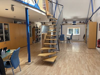 The first floor offices provide open plan accommodation with a small mezzanine floor suitable for storage. There is an open plan kitchen area including an oven, sink and space for a fridge and double doors lead to the external terrace. Male and female toilets are provided on the landings between the ground and first floors.