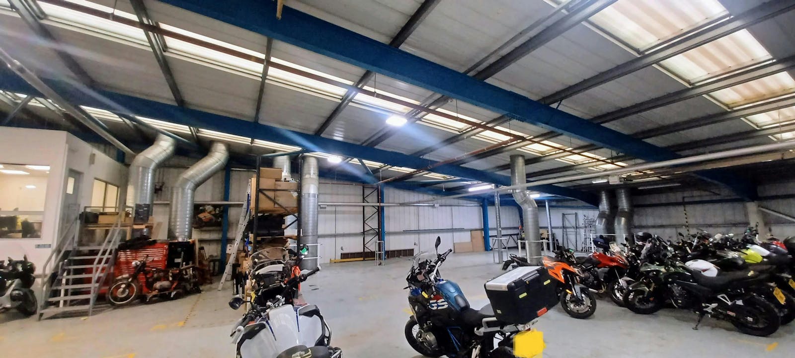 The internal ground to mezzanine height is 3.3m and the mezzanine to apex is 5.6m. Should the mezzanine be removed the maximum internal clearance would be circa 9.66 m.