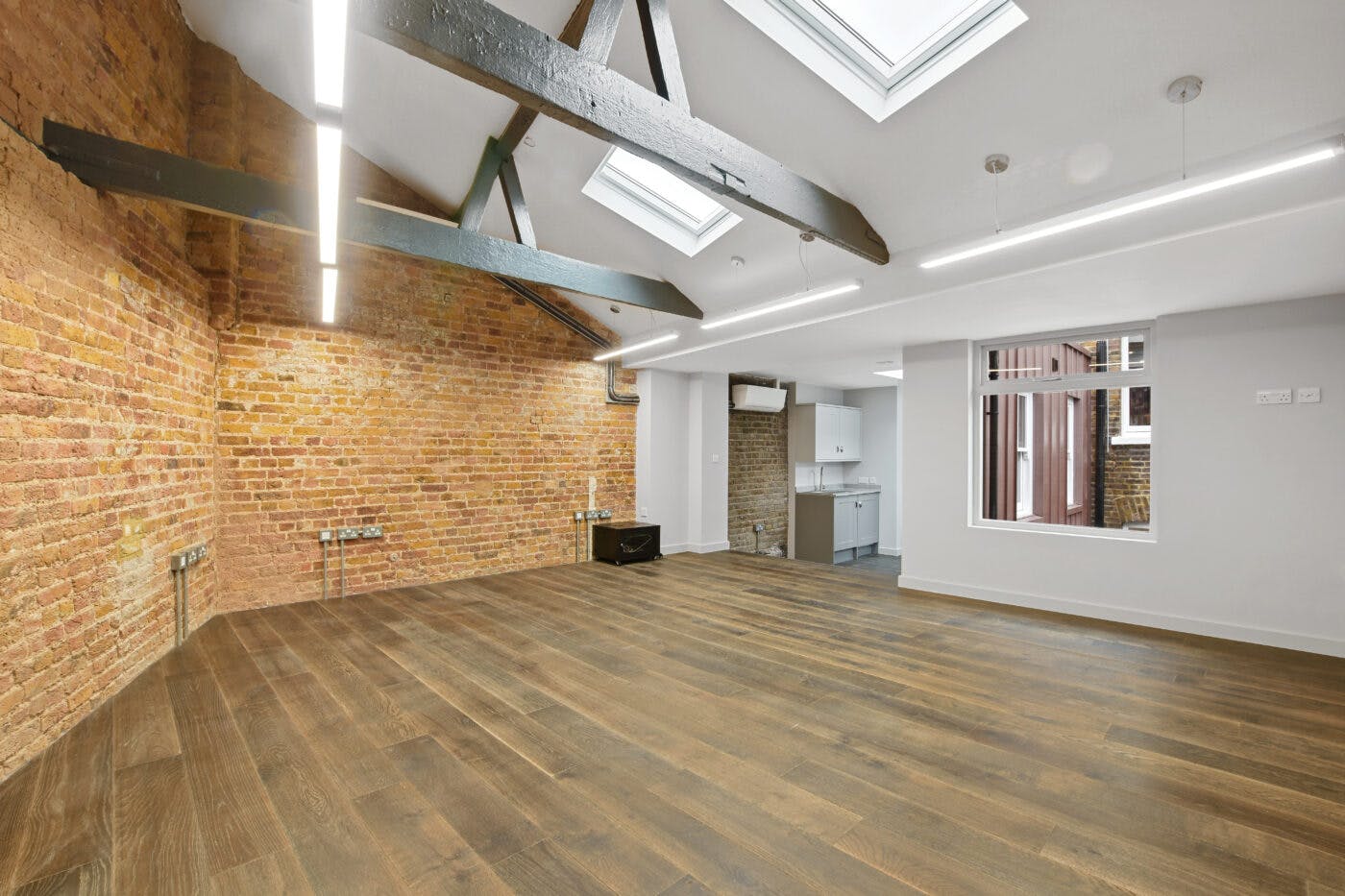 A stunning office occupying the top floor of an impressive Victorian building. Flooded with natural light from expansive dual-aspect windows. Featuring solid wood floors, exposed brickwork, air conditioning and kitchenette.