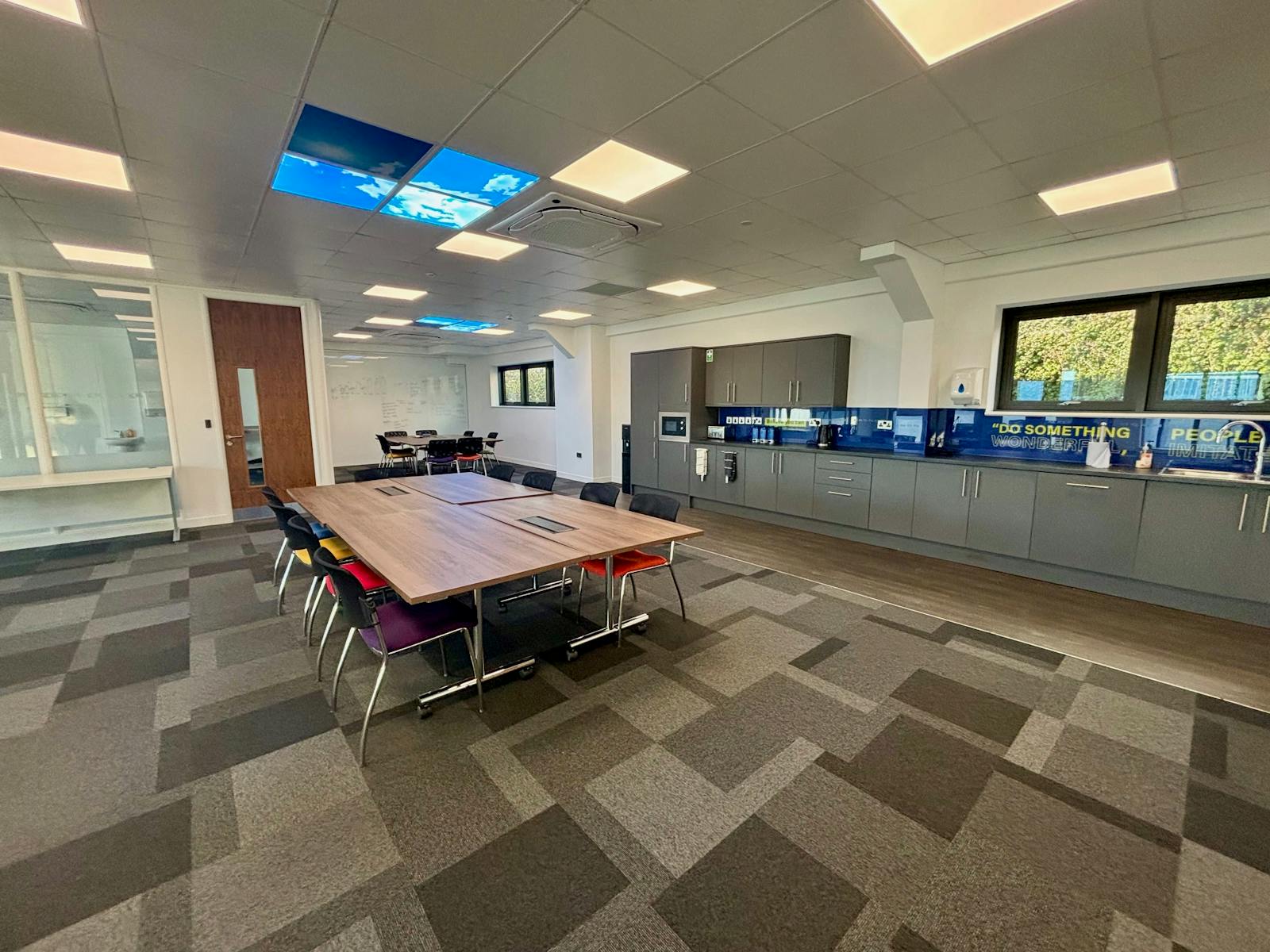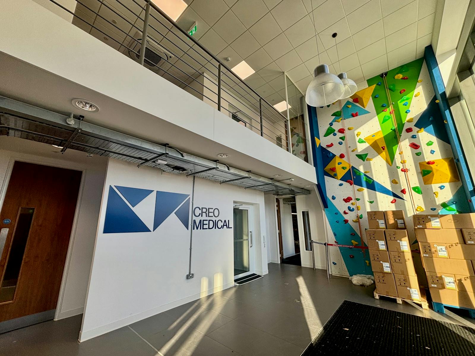 The layout includes a variety of boardrooms, meeting rooms, managers’ offices, breakout spaces, and a well‑appointed kitchen. Many of these areas benefit from full‑height glazed partitions and doors, creating an open and spacious feel. The reception area provides an impressive full‑height atrium and incorporates a climbing wall.