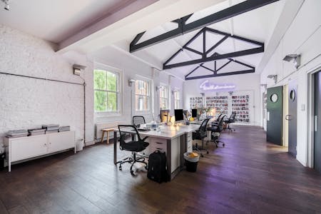 The 1st floor provides an open plan workspace with exposed roof trusses creating volume space enhanced by the large sash windows overlooking the courtyard delivering great natural light.