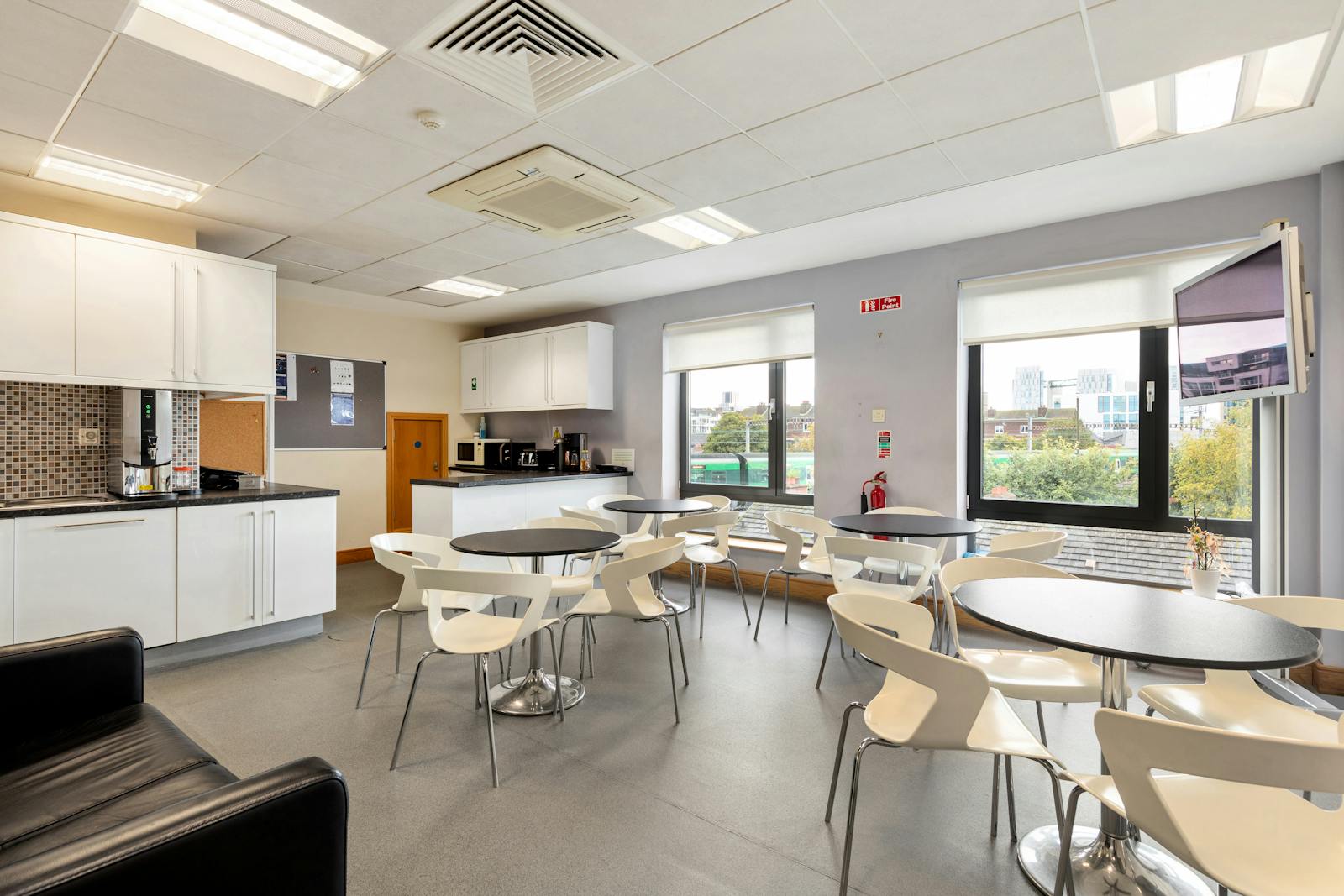 This turnkey office suite features a spacious open-plan workspace, a welcoming reception and seating area, three private offices, and a ten-person boardroom. Additional amenities include a fully fitted kitchen, comms room, storeroom, and WC facilities, along with an accessible toilet incorporating a shower.
