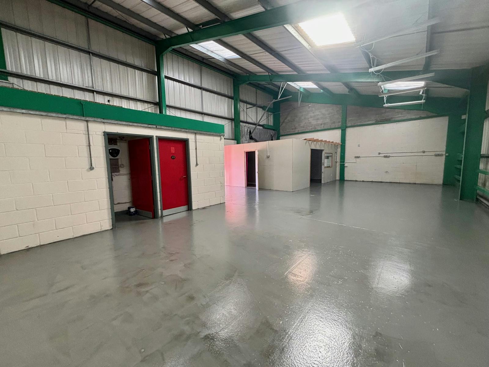A mid-terraced unit comprising of steel frame construction with part brick/ block and steel clad elevations and roof incorporating translucent panels. The unit benefits from a large external parking / loading area.