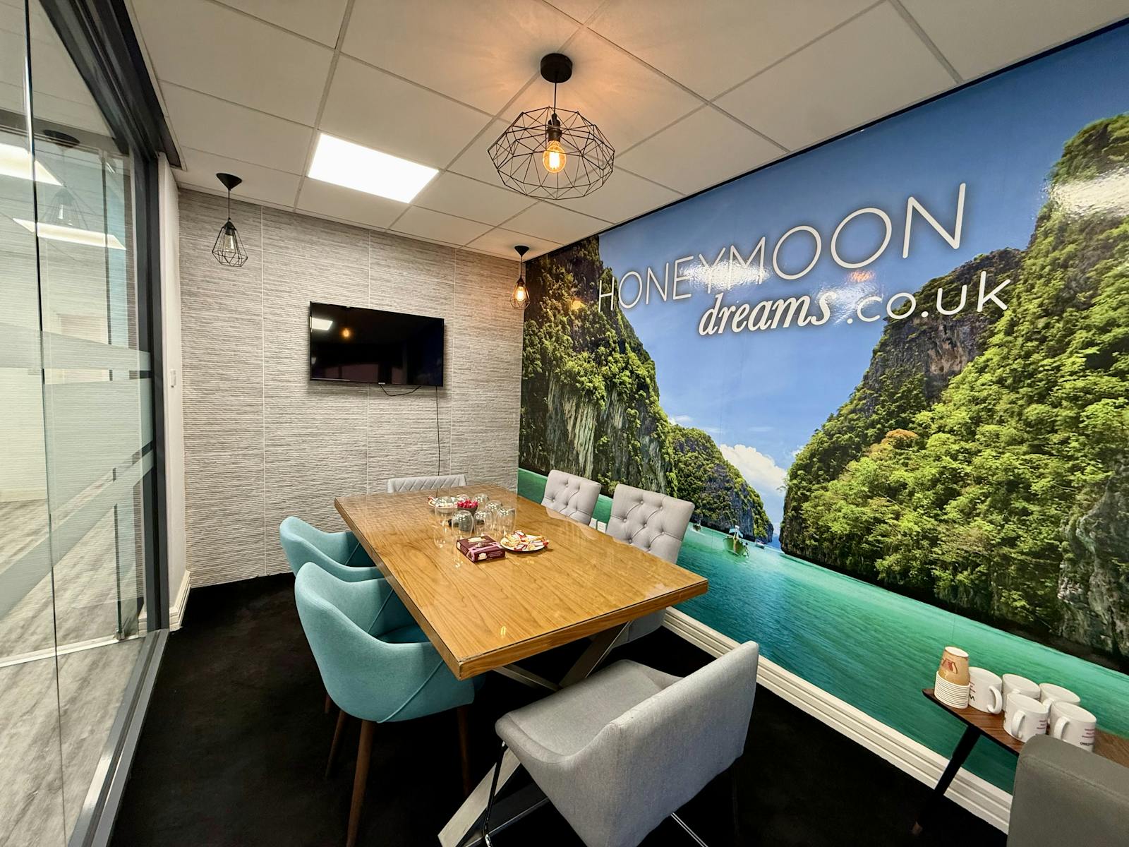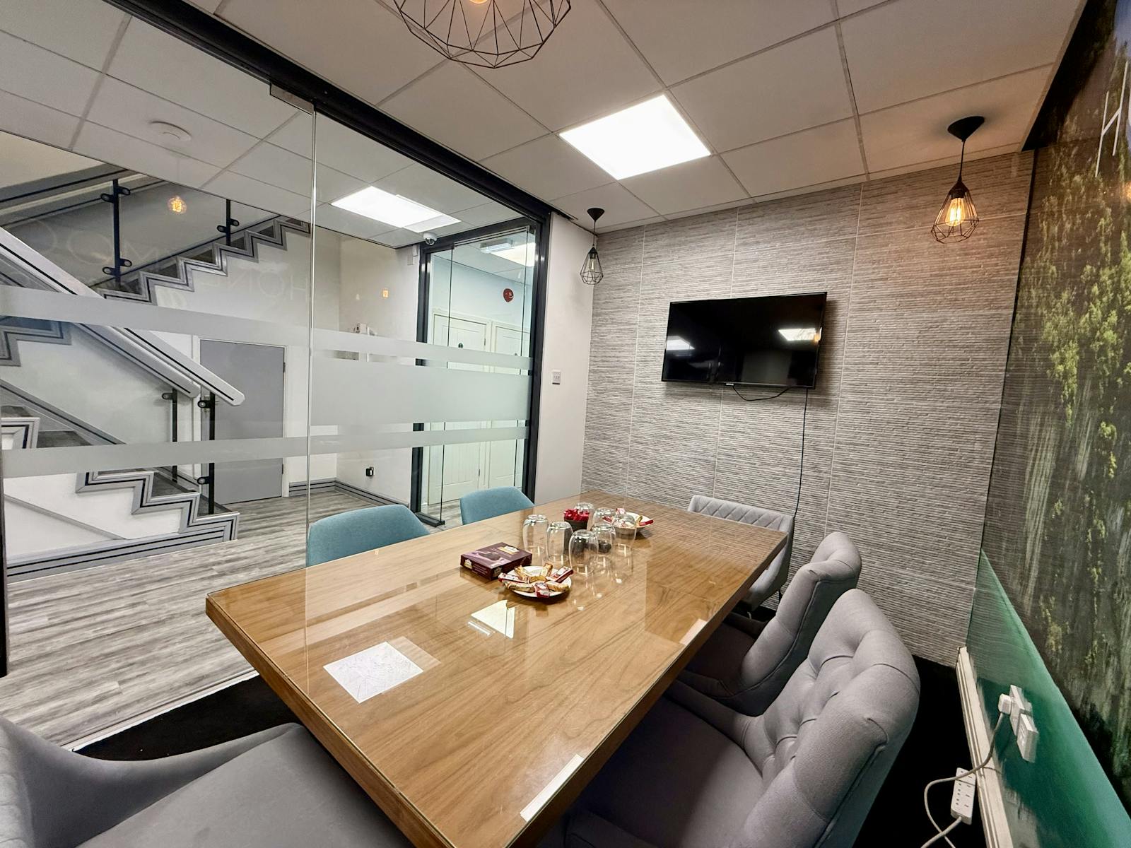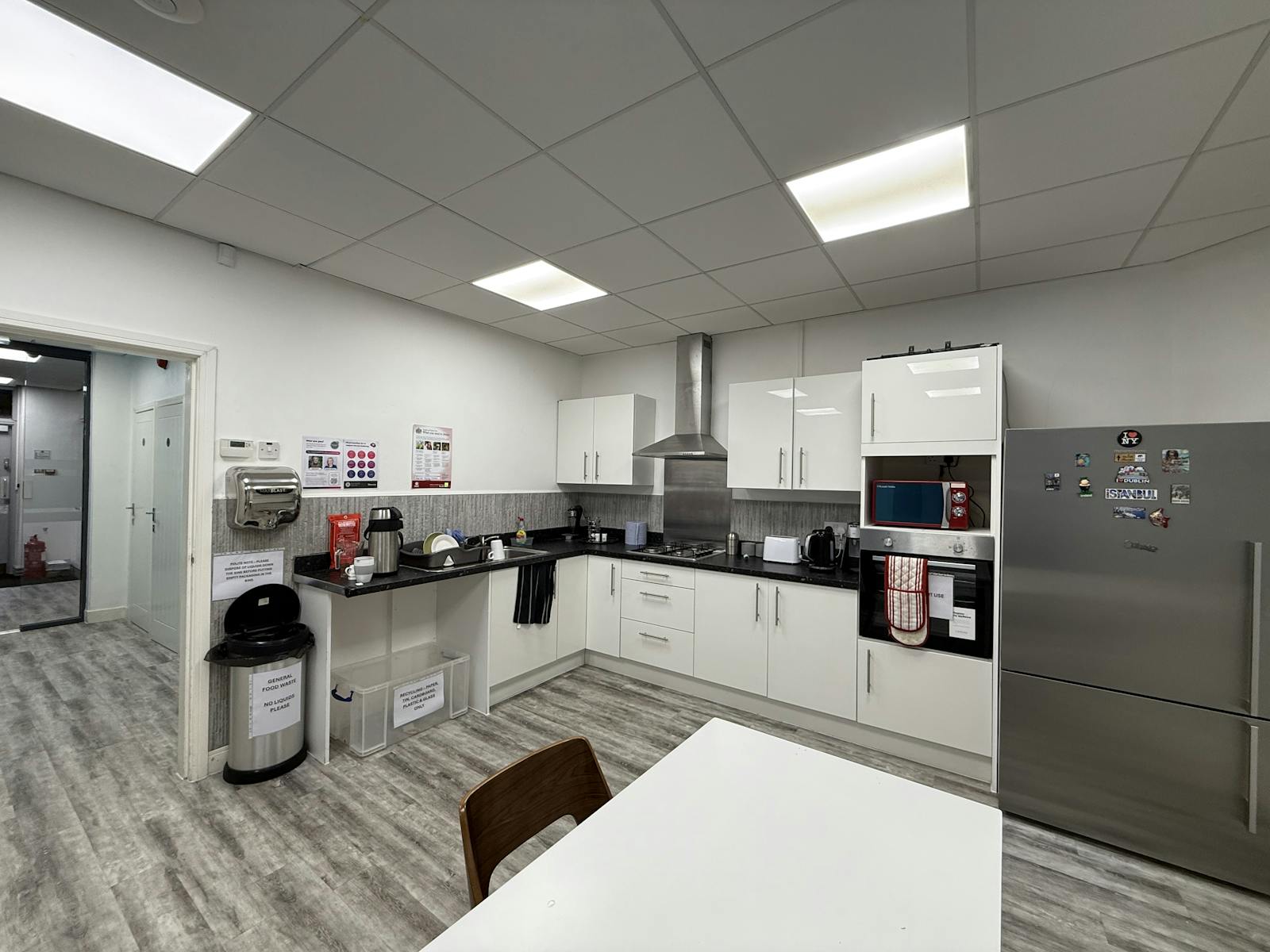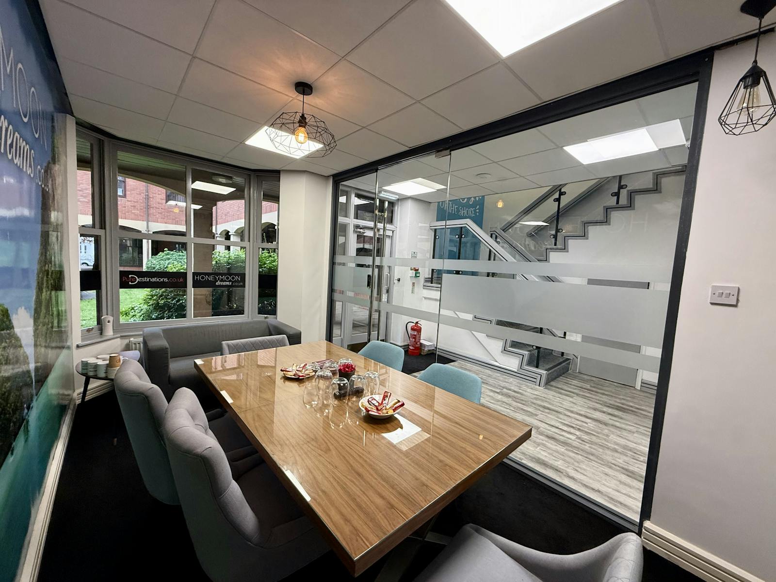 Access is via the ground floor, which opens into a welcoming reception area with a secure door entry system. Immediately to the right is a glazed meeting room, while a central corridor provides access to three WCs and a fully fitted kitchen with breakout area. This level also includes a smaller meeting room or private office.