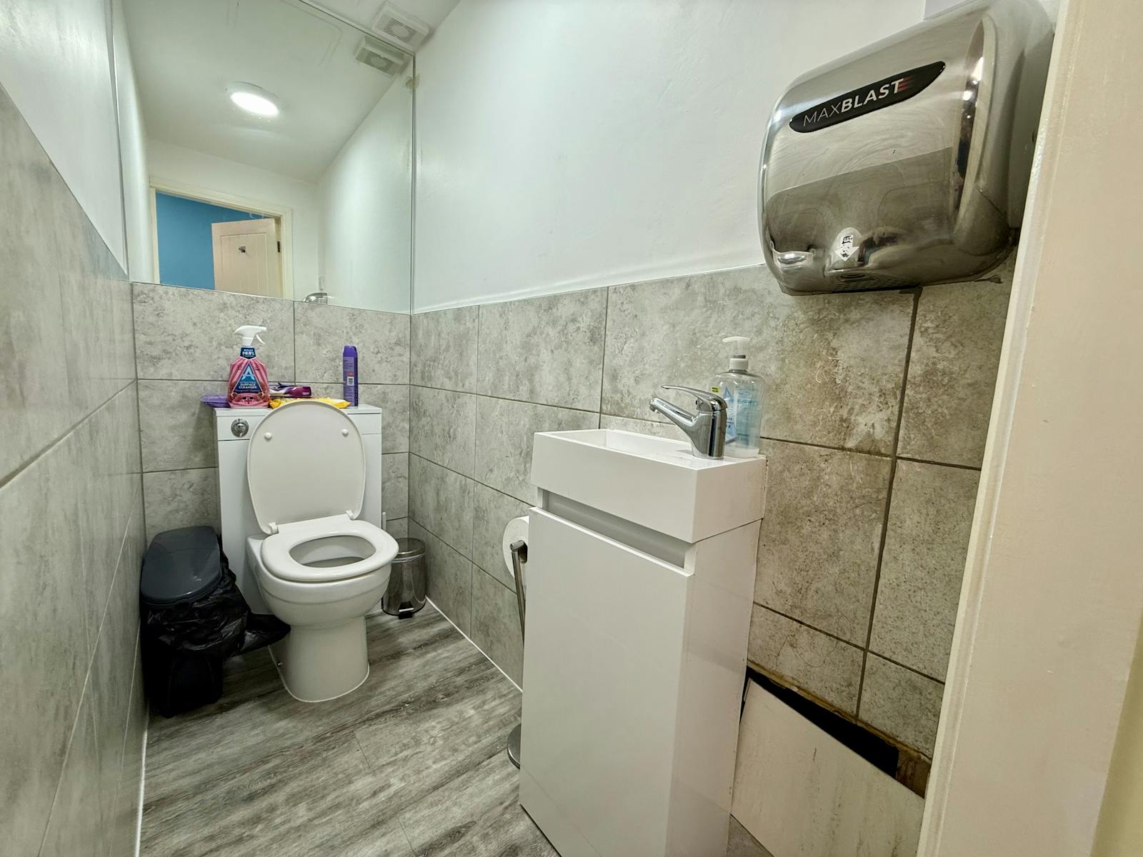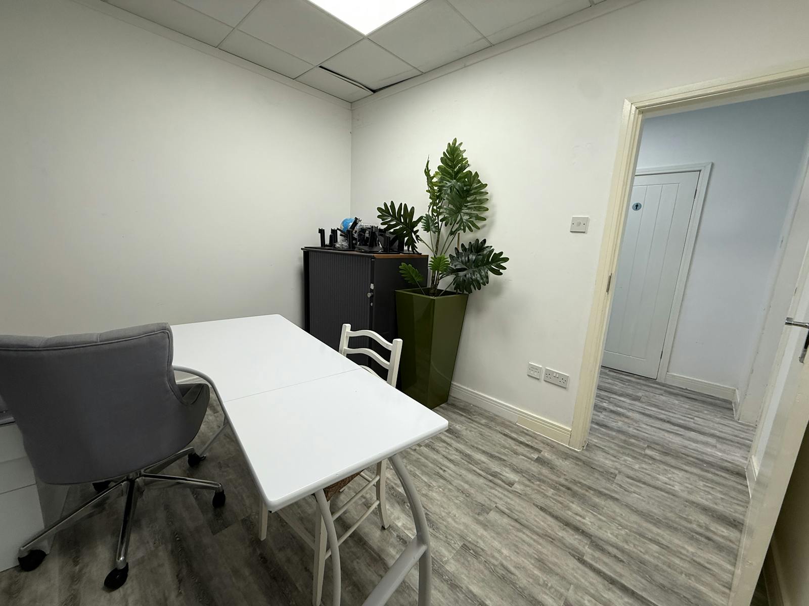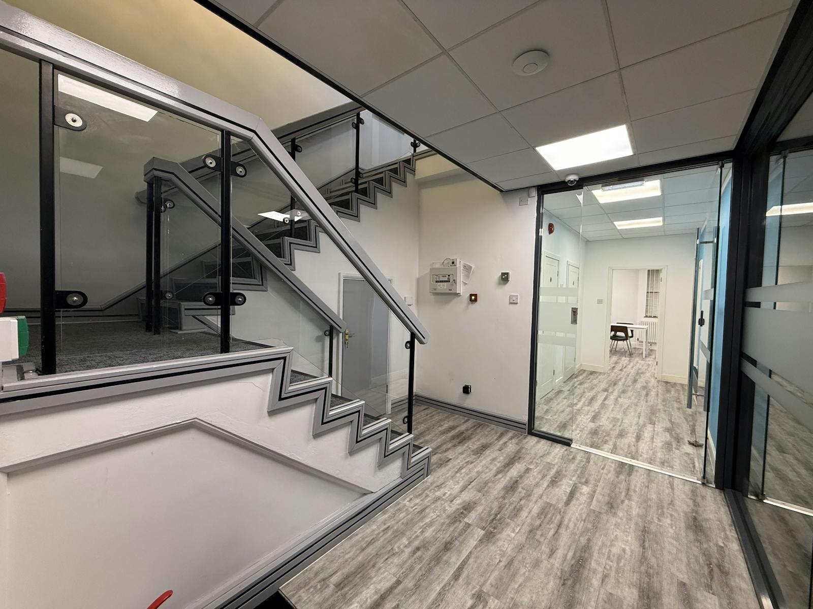 An internal staircase leads to the first floor, which opens onto a spacious open-plan office with three generous private offices off. One benefits from a glazed partition, allowing natural light to flow throughout. The first floor also features ducted air conditioning for year-round comfort.