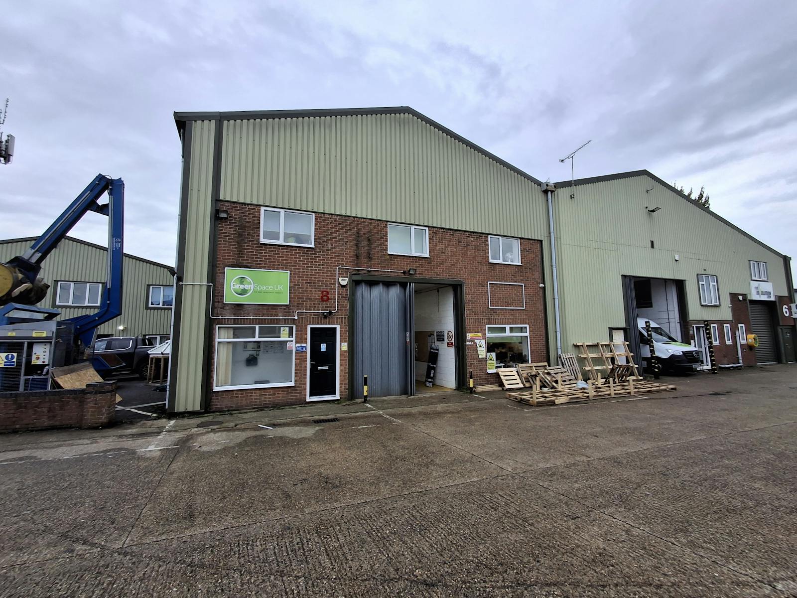 Unit 8 is a mid terrace industrial/warehouse premises of steel portal frame construction with a pitched roof incorporating daylight panels and concrete floor. The unit benefits from a 1st and 2nd floor mezzanine and the height below is 3.5m. The internal eaves height is approx. 7.7m and the roller shutter door measures approx. 3.5m W H.Internally,there is a separate personnel door, ground and first floor offices,M&F WC, kitchenette / breakout area, lighting and has 3 phase electricity.