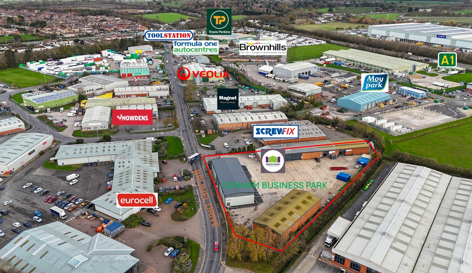 The property occupies a prominent position on Brunel Drive at the heart of the town’s established and popular Brunel Drive Industrial Estate just off the A1/A46/A17 road junctions providing excellent access locally, regionally & nationally.