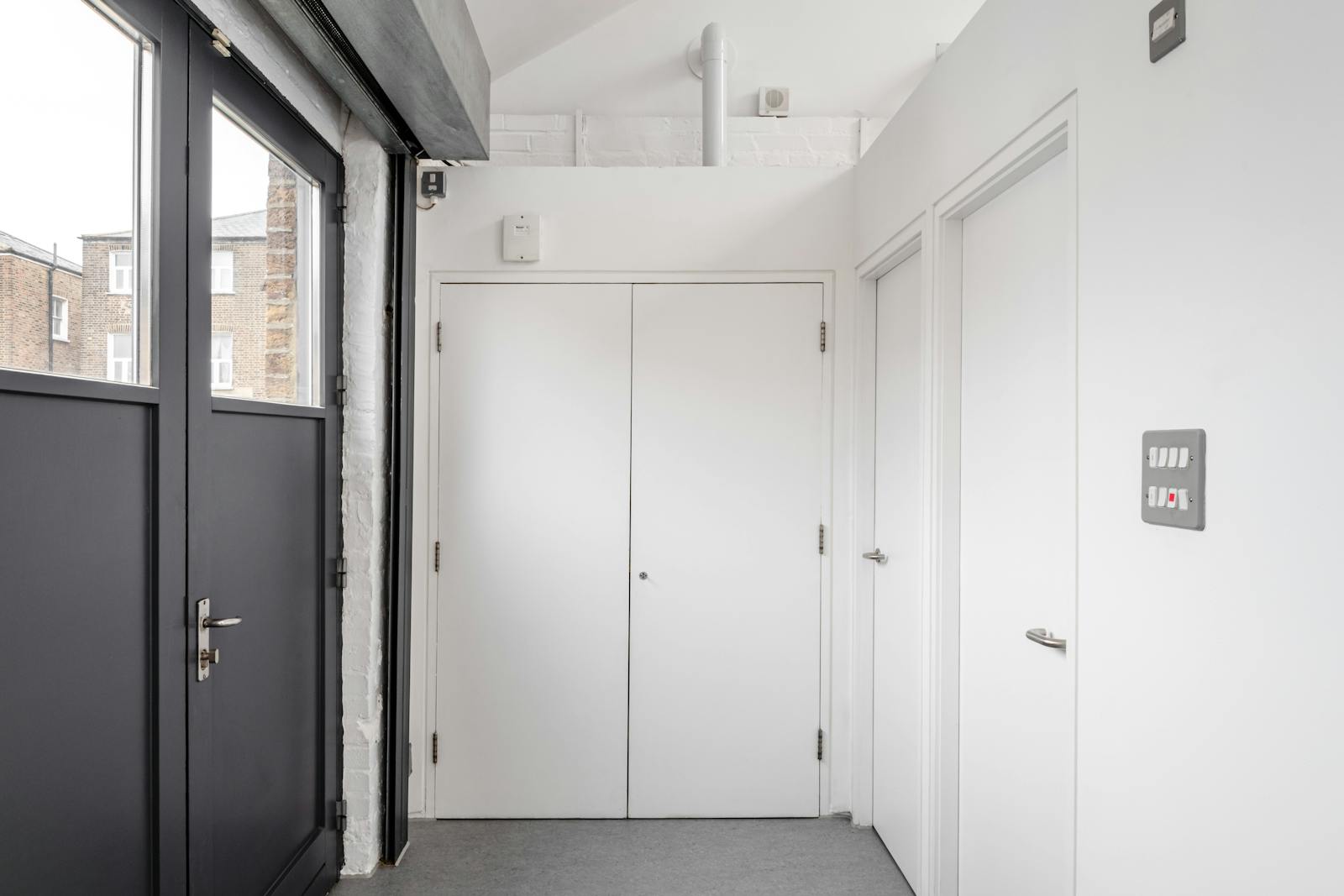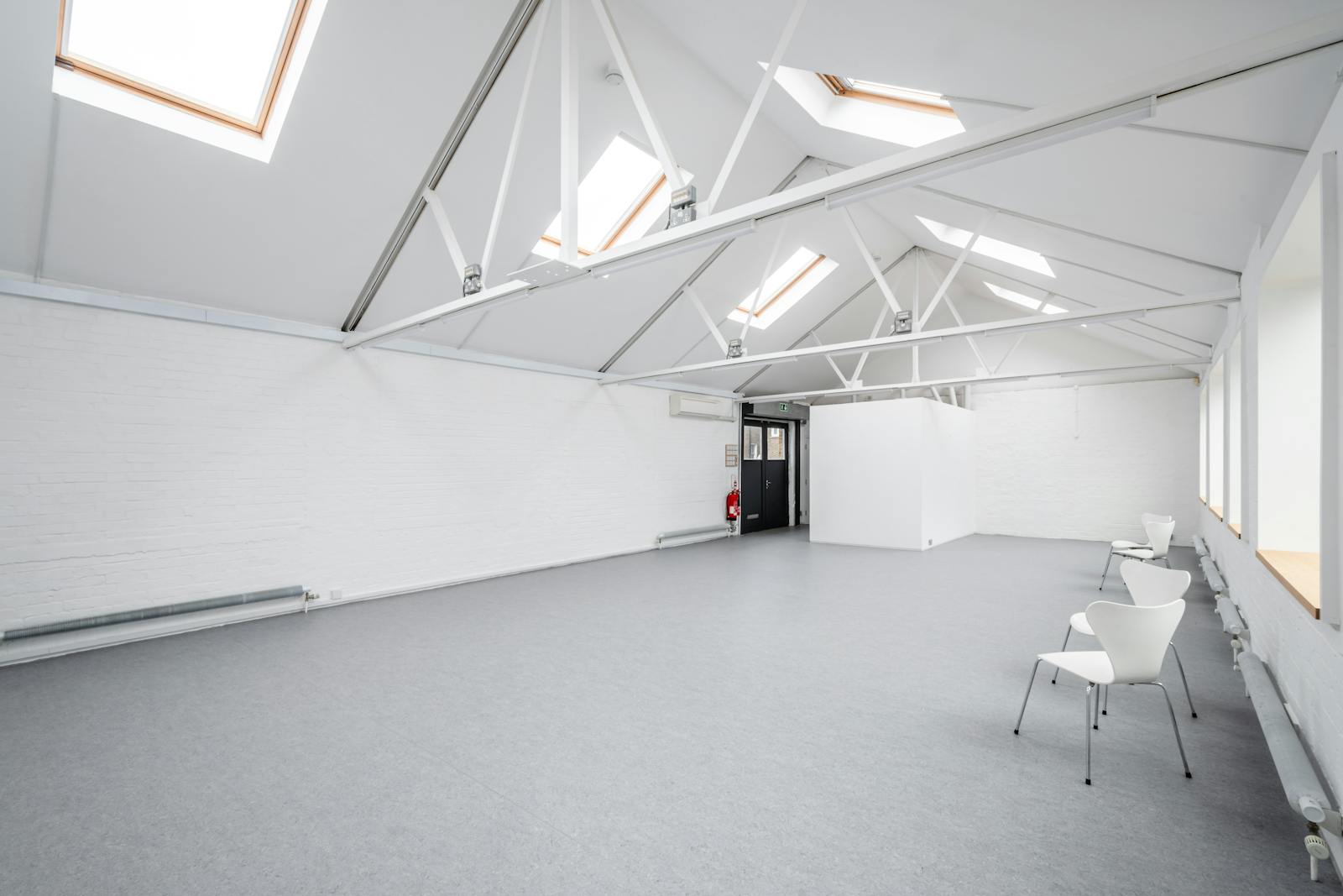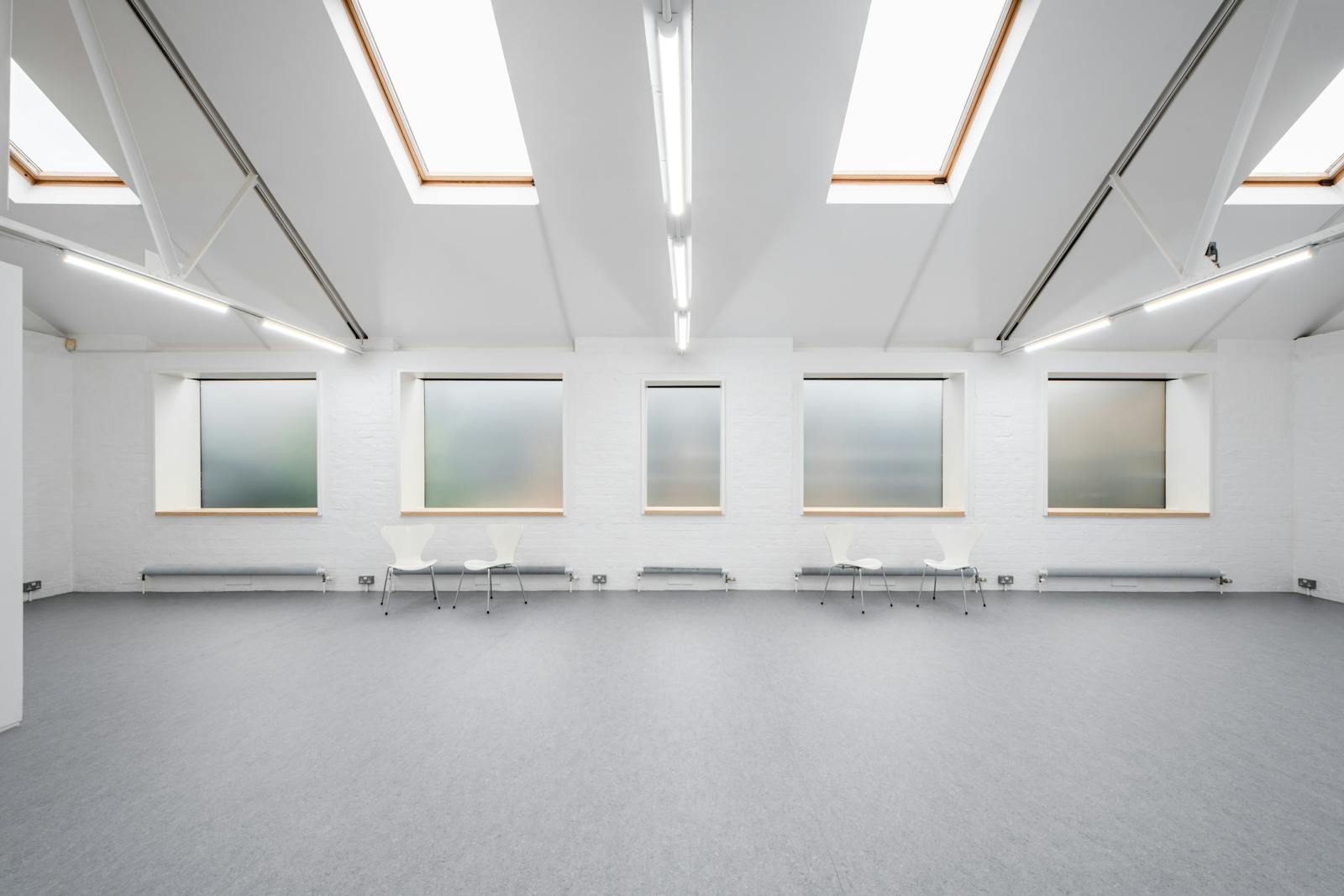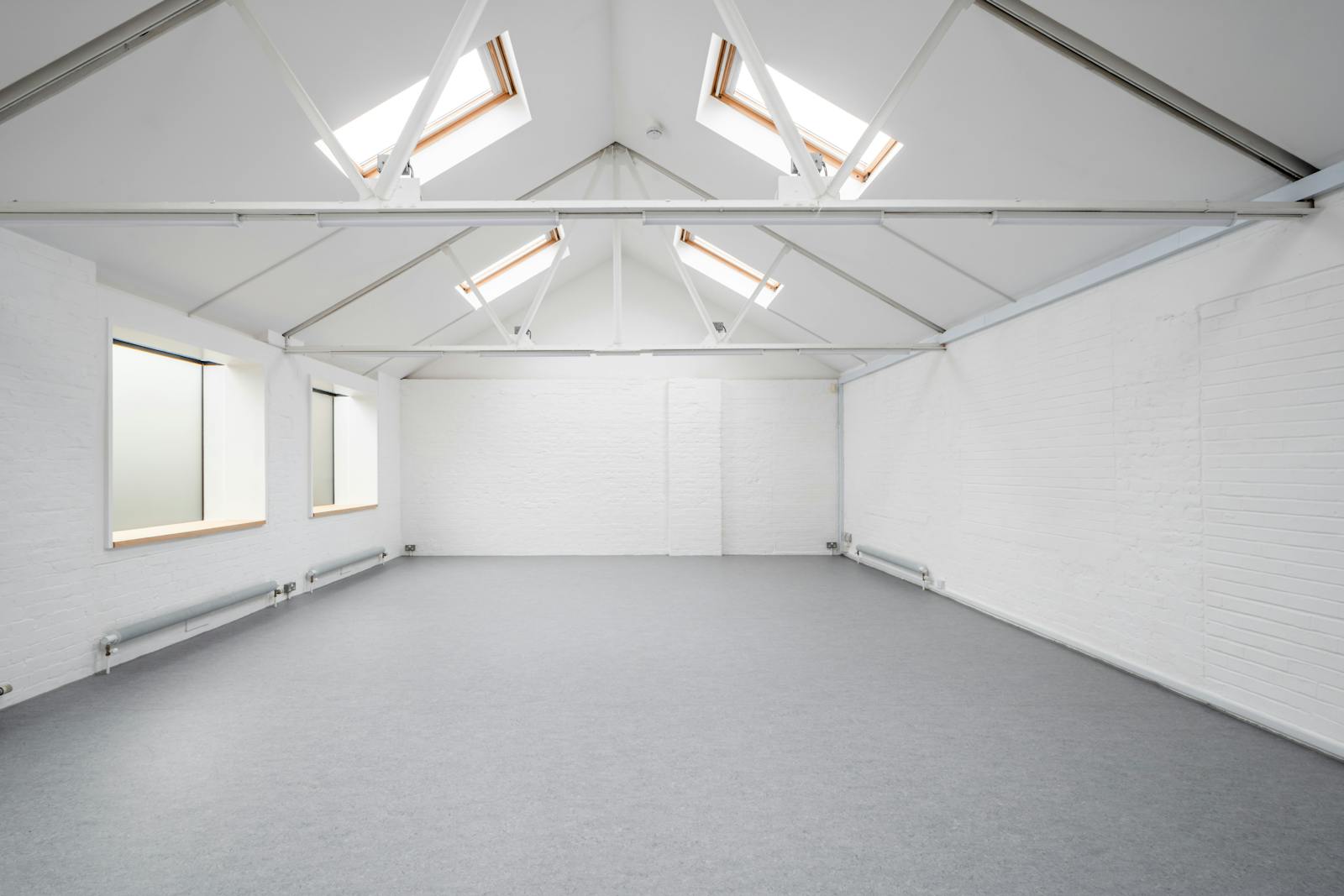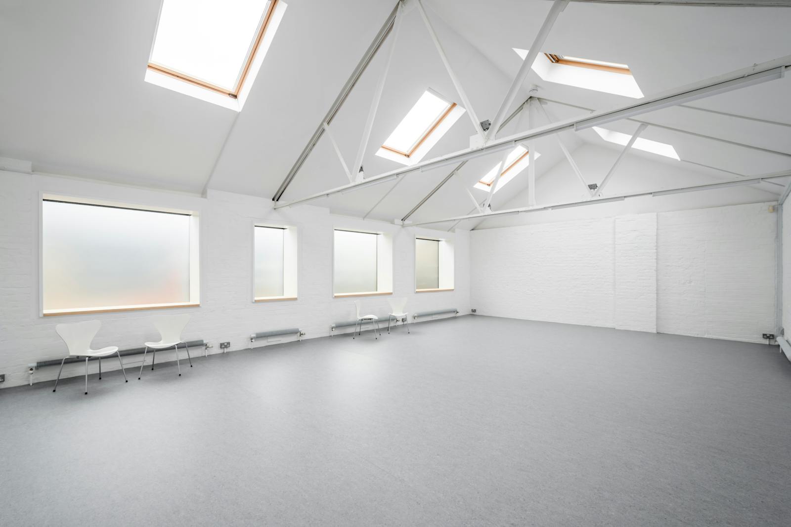 A bright and versatile 1,092 sq ft self-contained studio/office/workshop, ideal for creative professionals. This first-floor space, recently refurbished throughout, offers high ceilings and abundant natural light from seven roof skylights with solar-powered opening and solar-powered white blackout blinds, and from five double-glazed window units. There are LED strip lights, and new linoleum flooring, along with a kitchenette, shower, air conditioning, roller shutter, and an independent alarm system. Access is via a private external staircase, with cycle racks on site and one parking space is included. Set within a quiet, gated courtyard of live/work properties.
