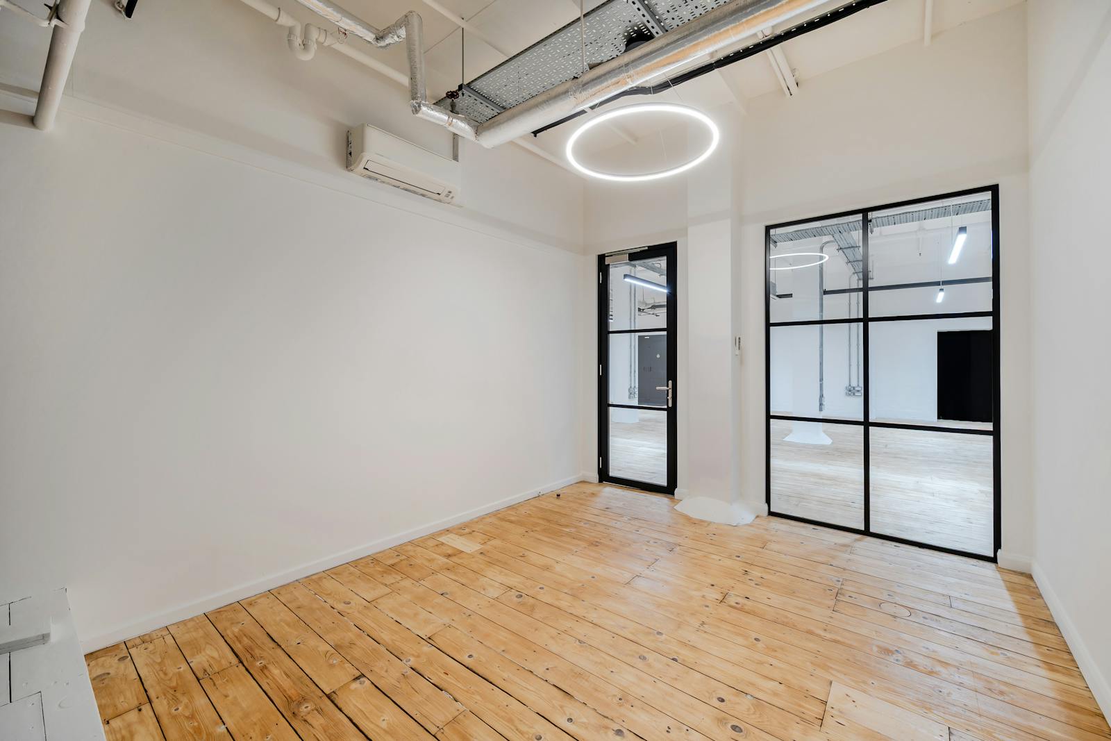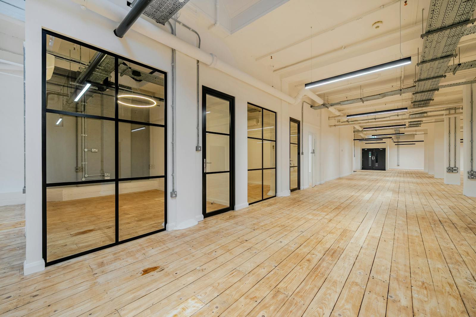 The premises is configured as an open plan workspace with glazed meeting rooms, large kitchen and break out areas, storage room and direct access to the goods lift. The space has excellent ceiling height and a very good level of natural light from a large glazed pitched skylight.