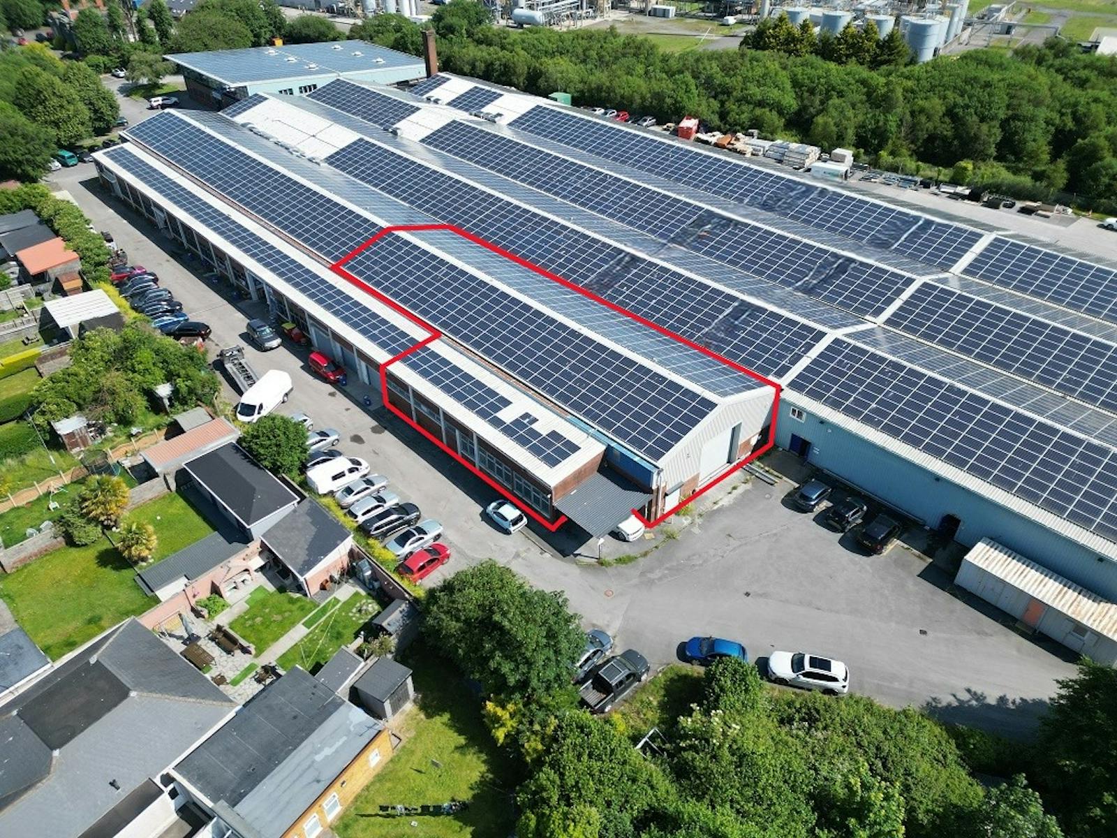 The unit is of steel portal frame construction, with part brick and part clad elevations beneath a pitched roof fitted with solar panels. The property forms an L-shaped configuration and offers versatile warehouse/workshop space.