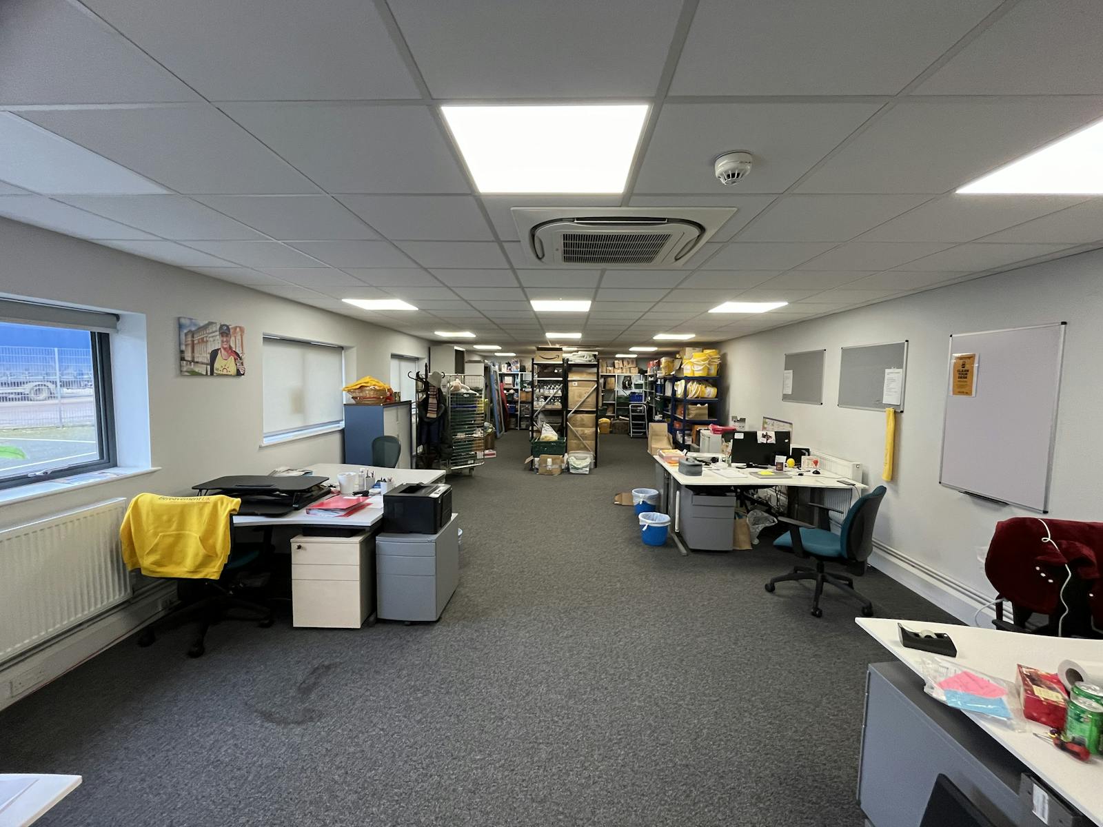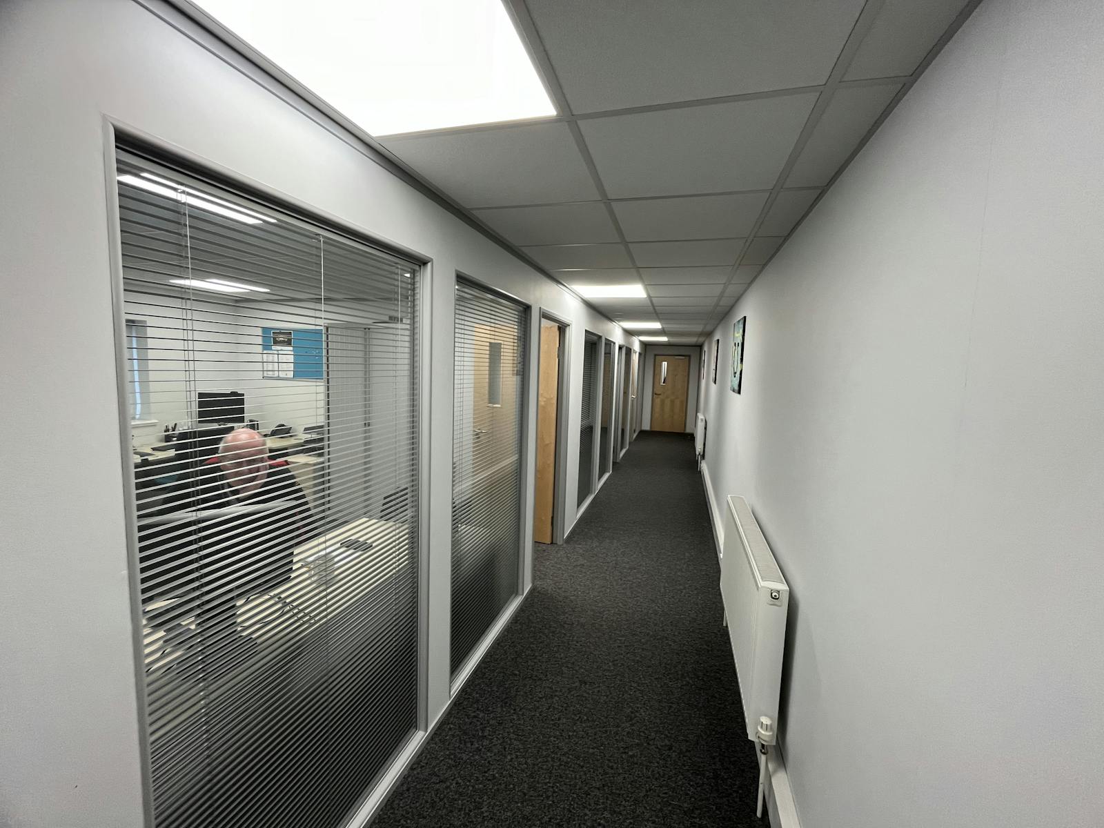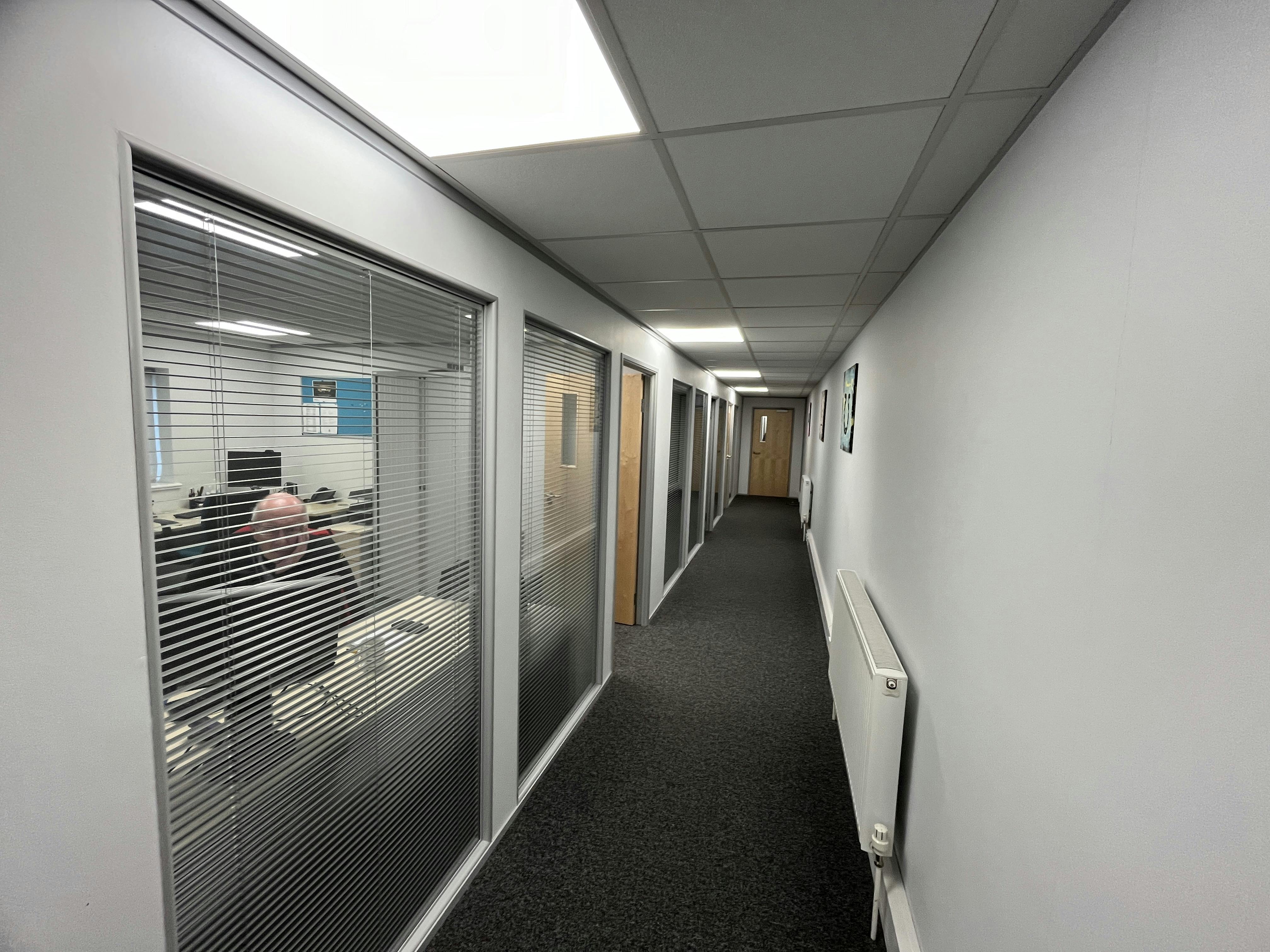 The space to be let provides two structurally open plan suites, either side of the shared reception area, on the ground floor. One of the areas is currently used for storage/fulfilment, the other a meeting suite with 5 separate offices and a post room, divided by demountable partitioning.